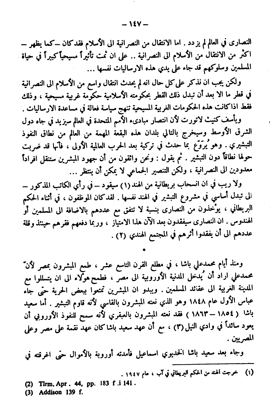 ولا ريب أن في انسحاب بريطانيا من الهند (¬1) سيقود - في رأي الكاتب المذكور - «إِلَى تَبَدُّلٍ أَسَاسِيٍّ فِي مَشْرُوعِ التَّبْشِيرِ فِي الهِنْدِ نَفْسِهَا. لَقَدْ كَانَ المُوَظِّفُونَ، فِي أَثَناءِ الحُكْمِ البَرِيطَانِيِّ، يُؤَخَذُونَ مِنَ النَّصَارَى بِنِسَبَةٍ لاَ تَتَّفِقُ مَعَ عَدَدِهِمْ بِالإِضَافَةِ إِلَى المُسْلِمِينَ أَوْ الهُنْدُوسْ. إِنَّ النَّصَارَى سَيَفْقِدُونَ بَعْدَ الآنَ هَذَا الاِمْتِيازَ، وَرُبَّمَا دَفَعَهُمْ فَقْرُهُمْ حِينَئِذٍ وَقِلَةُ عَدَدِهِمْ إِلَى أَنْ يَفْقِدُوا أَثَرَهُمْ فِي المُجْتَمَعِ الهِنْدِيِّ» (¬2).