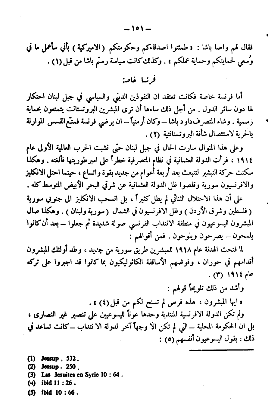 على أن هذا الاحتلال الثنائي لم يطل كثيرًا، بل انسحب الإنجليز إلى جنوبي سورية (فلسطين وشرق الأردن) وظل الفرنسيون في الشمال (سورية ولبنان). وهكذا صال المبشرون اليسوعيون في منطقة الانتداب الفرنسي صولة شديدة ثم جعلوا - بعد أن كانوا يلمحون - يصرحون ويلوحون. فمن أقوالهم: