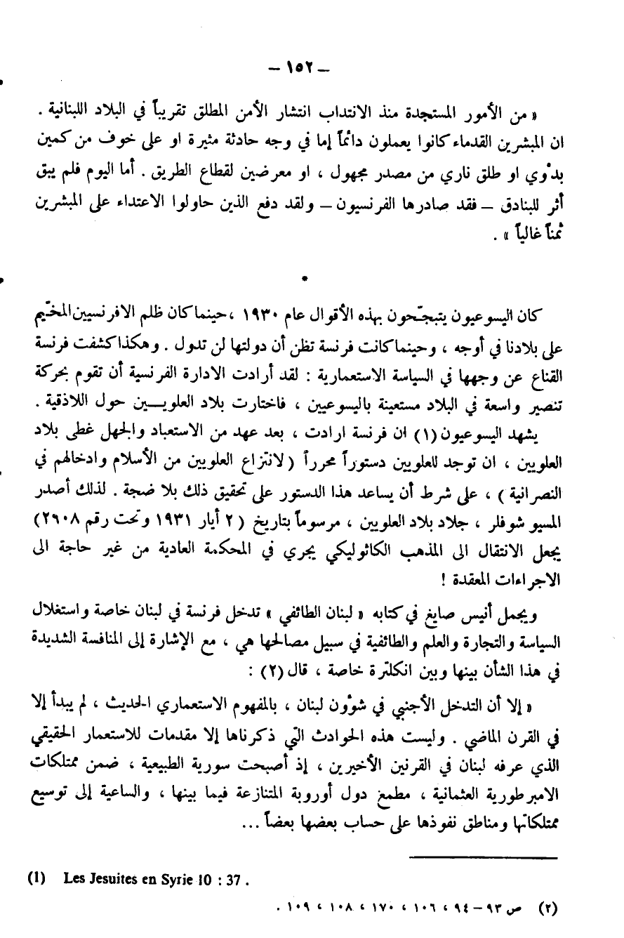 كان اليسوعيون يتبجحون بهذه الأقوال عام 1930، حينما كان ظلم الفرنسيين المخيم على بلادنا فِي أَوْجِهِ، وحينما كانت فرنسا تظن أن دولتهم لن تدول. وهكذا كشفت فرنسا القناع عن وجهها في السياسة الاستعمارية: لقد أرادات الإدارة الفرنسية أن تقوم بحركة تنصير واسعة في البلاد مستعينة باليسوعيين، فاختارت بلاد العلويين حول اللاذقية.