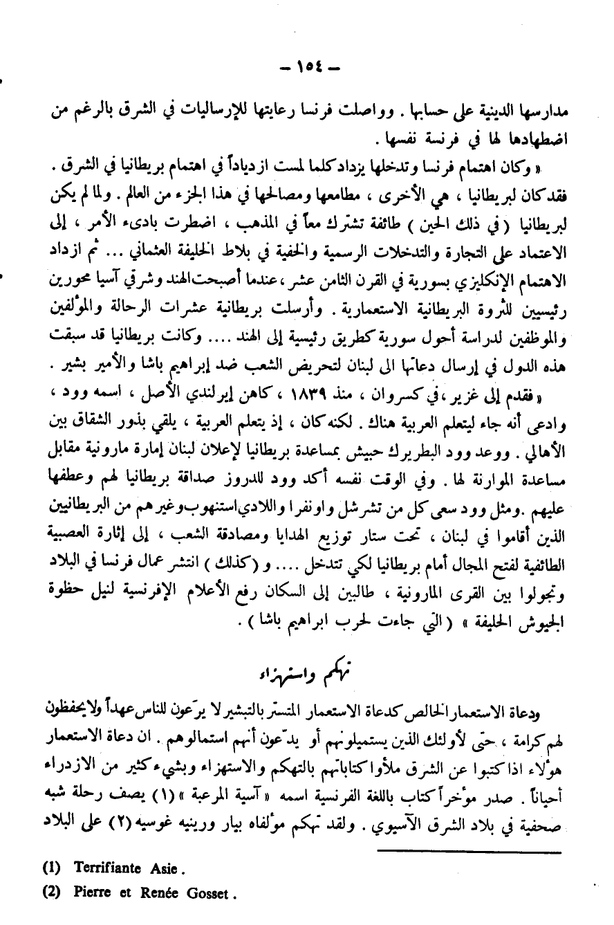 ودعاة الاستعمار الخالص كدعاة الاستعمار المتستر بالتبشير لا يرعون للناس عهدًا ولا يحفظون لهم كرامة، حتى لأولئك الذين يستميلونهم أو يدعون أنهم استمالوهم. إن دعاة الاستعمار هؤلاء إذا كتبوا عن الشرق ملأوا كتاباتهم بالتهكم والاستهزاء وبشيء كثير من الازدراء أحيانًا. صدر مؤخرًا كتاب باللغة الفرنسية اسمه " آسيا المرعبة " (¬1) يصف رحلة شبه صحفية في بلاد الشرق الآسيوي. ولقد تهكم مؤلفاه (بيار) و (رينيه غوسيه) (¬2) على البلاد