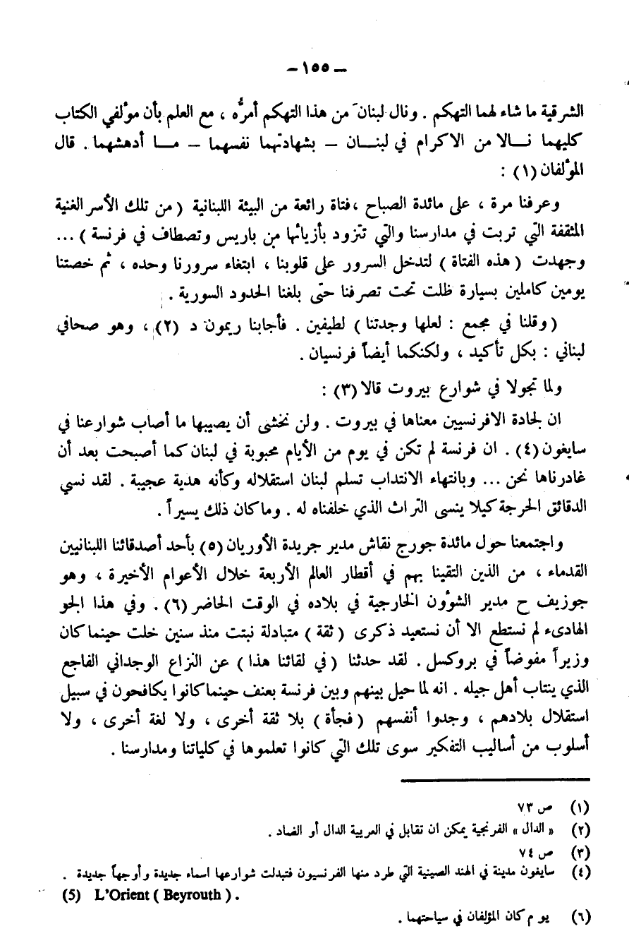 «إِنَّ لِجَادَّةِ الفِرَنْسِيِّينَ مَعْنَاهَا فِي بَيْرُوتْ. وَلَنْ نَخْشَى أَنْ يُصِيبَهَا مَا أَصَابَ شَوَارِعَنَا فِي سَايْغُونْ (¬4). إِنَّ فِرَنْسَا لَمْ تَكُنْ فِي يَوْمٍ مِنَ الأَيَّامِ مَحْبُوبَةً فِي لُبْنَانَ كَمَا أَصْبَحَتْ بَعْدَ أَنْ غَادَرْنَاهَا نَحْنُ ... وَبِاِنْتِهَاءِ الاِنْتِدابِ تَسَلُّمَ لُبْنَانُ اِسْتِقْلاَلَهُ وَكَأَنَّهُ هَدِيَّةٌ عَجِيبَةٌ. لَقَدْ نَسِيَ الدَّقائِقَ الحَرِجَةِ كَيْلاَ يَنْسَى التُّرَاثَ الذِي خَلَّفْنَاهُ لَهُ. وَمَا كَانَ ذَلِكَ يَسِيرًا. وَاِجْتَمَعْنَا حَوْلَ مَائِدَةِ (جُورْجْ نَقَّاشْ) مُدِيرُ جَرِيدَةِ " الأُورْيَانْ " (¬5) بِأَحَدِ أَصْدِقَائِنَا اللُّبْنَانِيِّينَ القُدَمَاءَ، مِنَ الذِينَ اِلْتَقَيْنَا بِهِمْ فِي أَقْطَارِ العَالَمِ الأَرْبَعَةِ خِلاَلَ الأَعْوَامِ الأَخِيرَةِ، وَهُوَ (جُوزِيفْ حَ) مُدِيرُ الشُّؤُونِ الخَارِجِيَّةِ فِي بِلادِهِ فِي الوَقْتِ الحَاضِرِ (¬6). وَفِي هَذَا الجَوِّ الهَادِئِ لَمْ نَسْتَطِعْ إلاَّ أَنْ نَسْتَعِيدَ ذِكْرَى (ثِقَةَ) مُتَبَادَلَةً نَبَتَتْ مُنْذُ سِنِينَ خَلَتْ حِينَمَا كَانَ وَزِيرًا مُفَوَّضًا فِي بْرُوكْسَالْ. لَقَدْ حَدَّثَنَا (فِي لِقَائِنَا هَذَا) عَنْ النِّزَاعِ الوِجْدَانِيِّ الفَاجِعِ الذِي يَنْتَابُ أَهْلَ جِيلِهِ. إِنَّهُ لَمَّا حِيلَ بَيْنَهُمْ وَبَيْنَ فِرَنْسَا بِعُنْفٍ حِينَمَا كَانُوا يُكَافِحُونَ فِي سَبِيلِ اِسْتِقْلاَلِ بِلاَدِهِمْ، وَجَدُوا أَنَفْسَهُمْ (فَجْأَةً) بَلاَ ثِقَةٍ أُخْرَى، وَلاَ لُغَةٍ أُخْرَى، وَلاَ أُسْلُوبٍ مِنْ أَسَالِيبِ التَّفْكِيرِ سِوَى تِلْكَ التِي كَانُوا تَعَلَّمُوهَا فِي كُلِّيَّاتِنَا وَمَدَارِسِنَا».