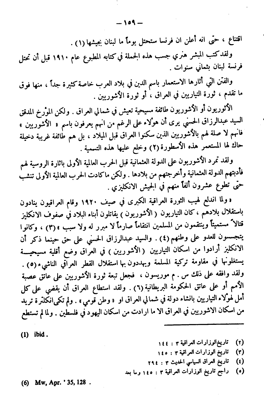 ولقد وافقه على ذلك (س. م. موريسون)، فجعل تبعة ثورة الأشوريين على عاتق عصبة الأمم أو على عاتق الحكومة البريطانية (¬6). ولقد استطاع العراق أن يقضي على كل أمل لهؤلاء التياريين بإنشاء دولة شمالي العراق أو «وطن قومي». ولم تكن إنجلترا تريد من إسكان الأشوريين في العراق إلا ما أرادت من إسكان اليهود في فلسطين. ولما لم تستطع