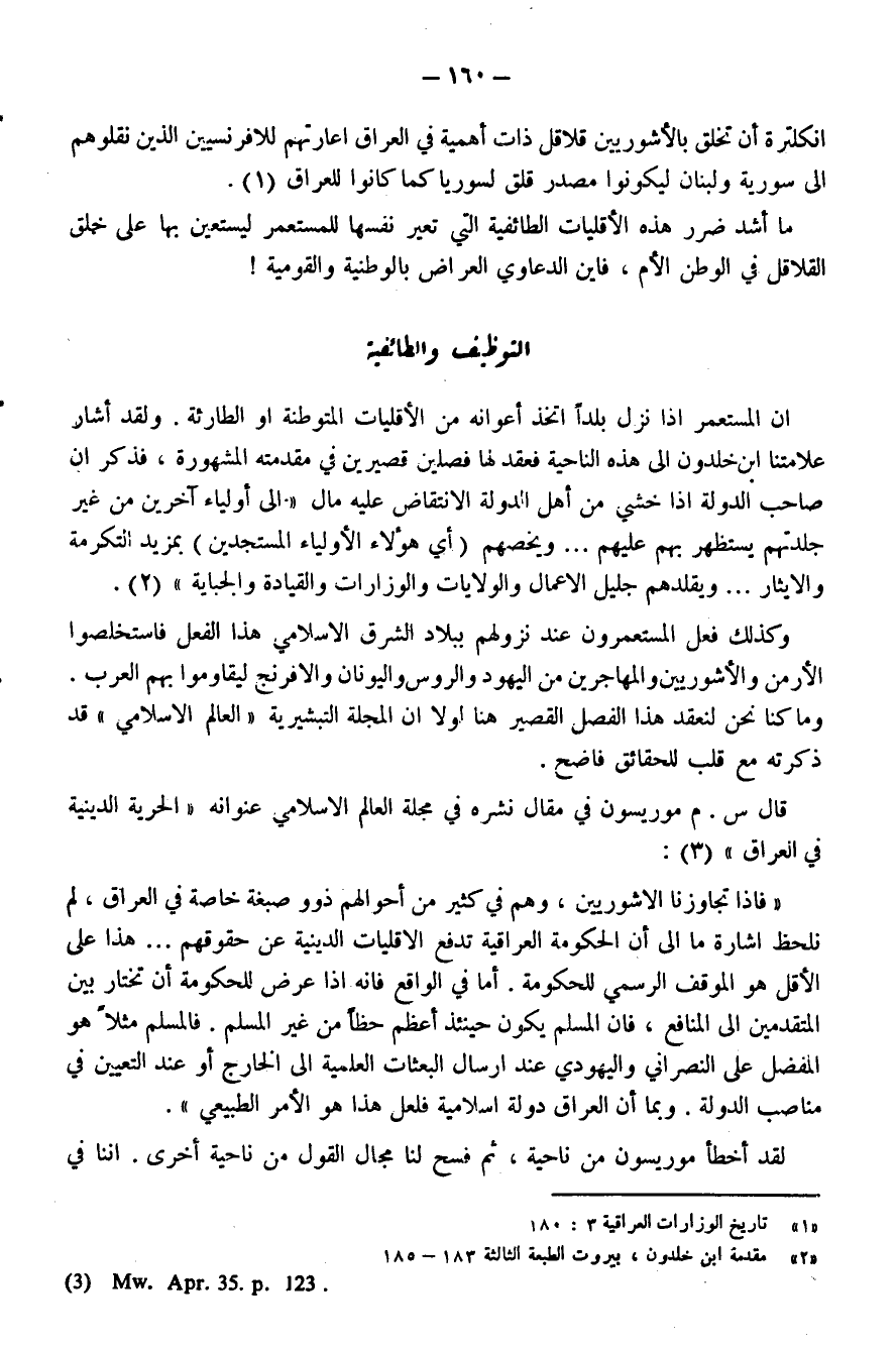 ما أشد ضرر هذه الأقليات الطائفية التي تعير نفسها للمستعمر ليستعين بها على خلق القلاقل في الوطن الأم، فأين الدعاوي العراض بالوطنية والقومية!؟.