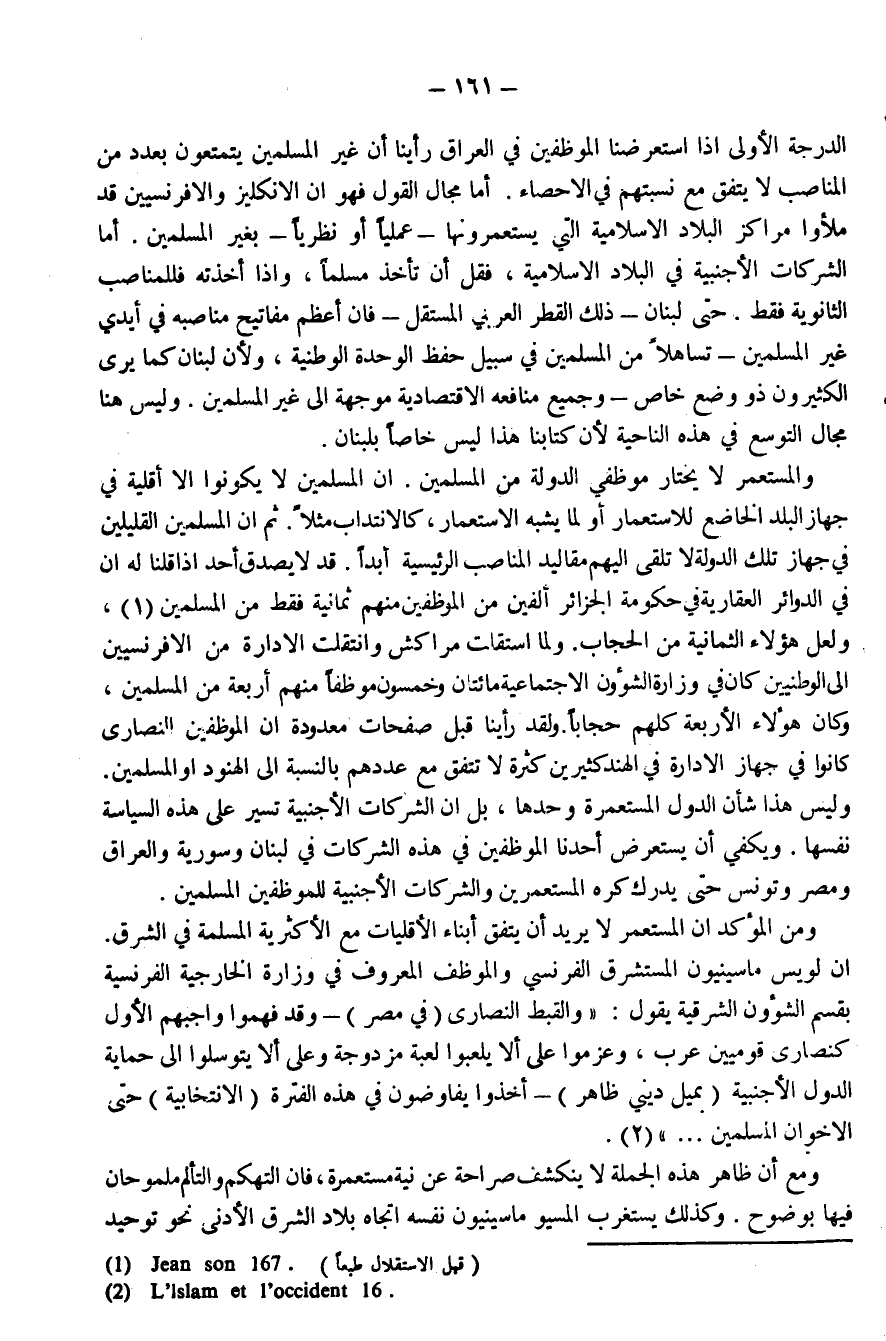 الدرجة الأولى إذا استعرضنا الموظفين في العراق رأينا أن غير المسلمين يتمتعون بعدد من المناصب لا يتفق مع نسبتهم في الإحصاء. أما مجال القول فهو أن الإنجليز والفرنسيين قد ملأوا مراكز البلاد الإسلامية التي يستعمرونها - عَمَلِيًّا أَوْ نَظَرِيًّا - بغير المسلمين. أما الشركات الأجنبية في البلاد الإسلامية، فَقَلَّ أن تأخذ مسلمًا، وإذا أخذته فللمناصب الثانوية فقط. حتى لبنان - ذلك القطر العربي المستقل - فإن أعظم مفاتيح مناصبه في أيدي غير المسلمين - تساهلاً من المسلمين في سبيل حفظ الوحدة الوطنية، ولأن لبنان كما يرى الكثيرون ذو وضع خاص - وجميع منافعه الاقتصادية موجهة إلى غير المسلمين. وليس هنا مجال التوسع في هذه الناحية لأن كتابنا هذا ليس خاصًا بلبنان.