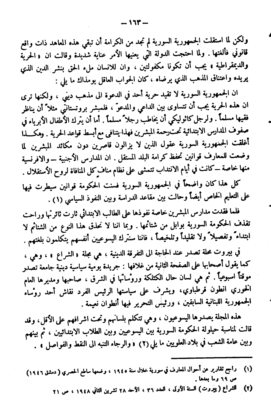 «إِنَّ الجُمْهُورِيَّةَ السُّورِيَّةَ لاَ تُقَيِّدُ حُرِّيَّةَ أَحَدٍ فِي الدَّعْوَةِ إِلَى مَذْهَبٍ دِينِيٍّ، وَلَكِنَّهَا تَرَى أَنَّ هَذِهِ الحُرِّيَّةَ يَجِبُ أَنْ تَتَسَاوَى بَيْنَ الدَّاعِي وَالمَدْعُوِّ، فَلِمُبَشِّرٍ بْرُوتِسْتَانْتِيٍّ مَثَلاً أَنْ يُنَاظِرَ فَقِيهًا مُسْلِمًا. وَلِرَجُلٍ كَاثُولِيكِيٍّ أَنْ يُخَاطِبَ رَجُلاً مُسْلِمًا. أَمَّا أَنْ يُتْرَكَ الأَطْفَالُ الأَبْرِيَاءُ فِي صُفُوفِ المَدَارِسِ الاِبْتِدَائِيَّةِ تَحْتَ رَحْمَةِ المُبَشِّرِينَ فَهَذَا يَتَنَافَى مَعَ أَبْسَطِ قَوَاعِدِ الحُرِّيَّةِ. وَهَكَذَا أَغْلَقَتْ الجُمْهُورِيَّةُ السُّورِيَّةُ عُقُولَ الذِينَ لاَ يُزَالُونَ قَاصِرِينَ دُونَ مَكَائِدِ المُبَشِّرِينَ لَمَّا وَضَعَتْ لِلْمَعَارِفِ قَوَانِينَ تَحْفَظُ كَرَامَةَ البَلَدِ المُسْتَقِلِّ. إِنَّ المَدَارِسَ الأَجْنَبِيَّةَ - وَالفِرَنْسِيَّةَ مِنْهَا خَاصَّةَ - كَانَتْ فِي أيام الاِنْتِدابِ تَتَمَشَّى عَلَى نِظَامٍ مُنَافٍ كُلَّ المُنَافَاةِ لِرُوحِ الاِسْتِقْلاَلِ. كُلُّ هَذَا كَانَ وَاضِحًا فِي الجُمْهُورِيَّةِ السُّورِيَّةِ فَسَنَّتْ الحُكُومَةُ قَوَانِينَ سَيْطَرَتْ فِيهَا عَلَى التَّعْلِيمِ الخَاصِّ أَيْضًا وَحَالَتْ بَيْنَ مَقَاعِدِ الدِّرَّاسَةِ وَبَيْنَ النُّفُوذِ السِّيَاسِيَّ» (¬1).