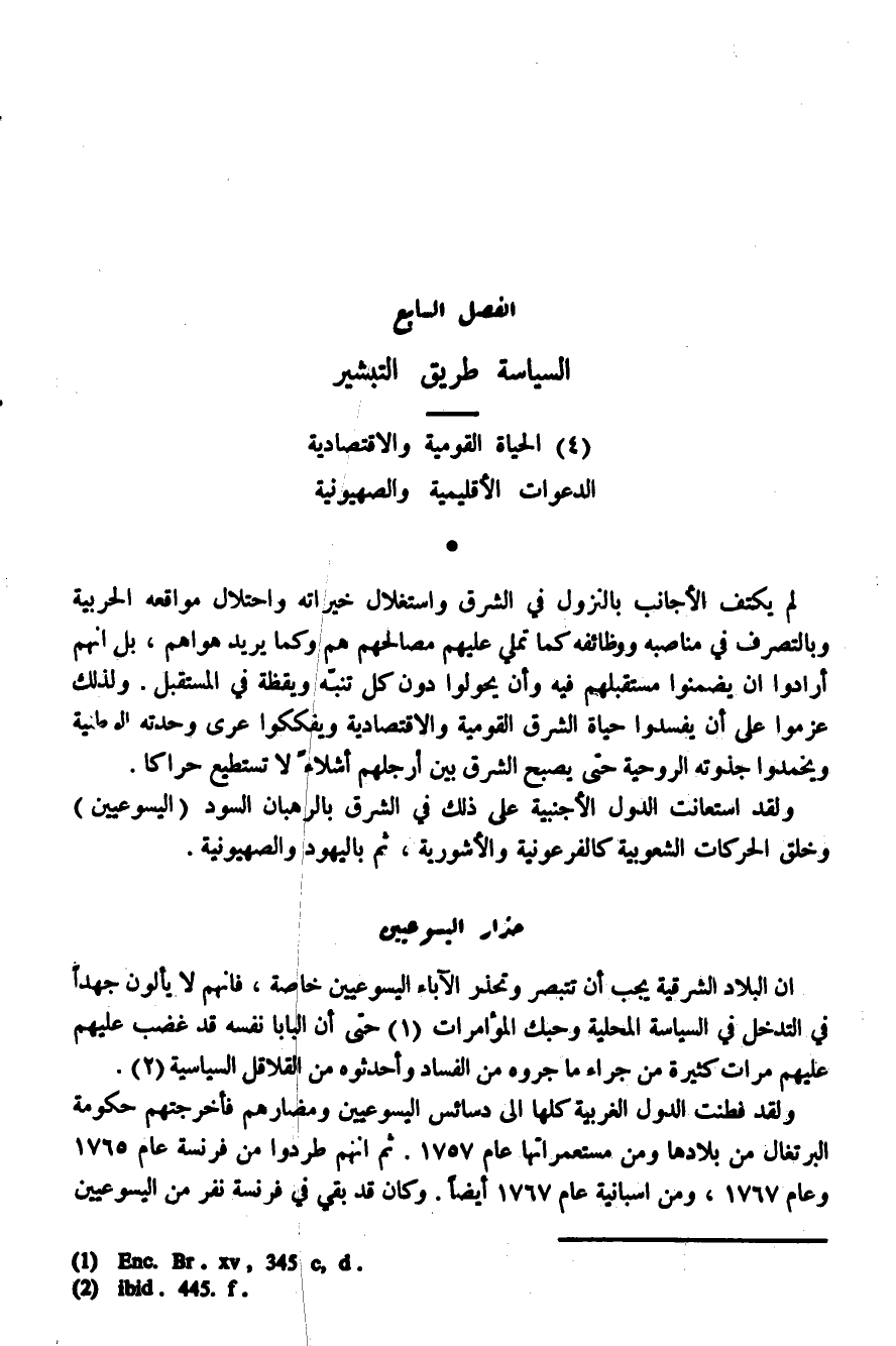 ولقد استعانت الدول الأجنبية على ذلك في الشرق بالرهبان السود (اليسوعيون) وخلق الحركات الشعوبية كالفرعونية والأشورية، ثم باليهود والصهيونية.