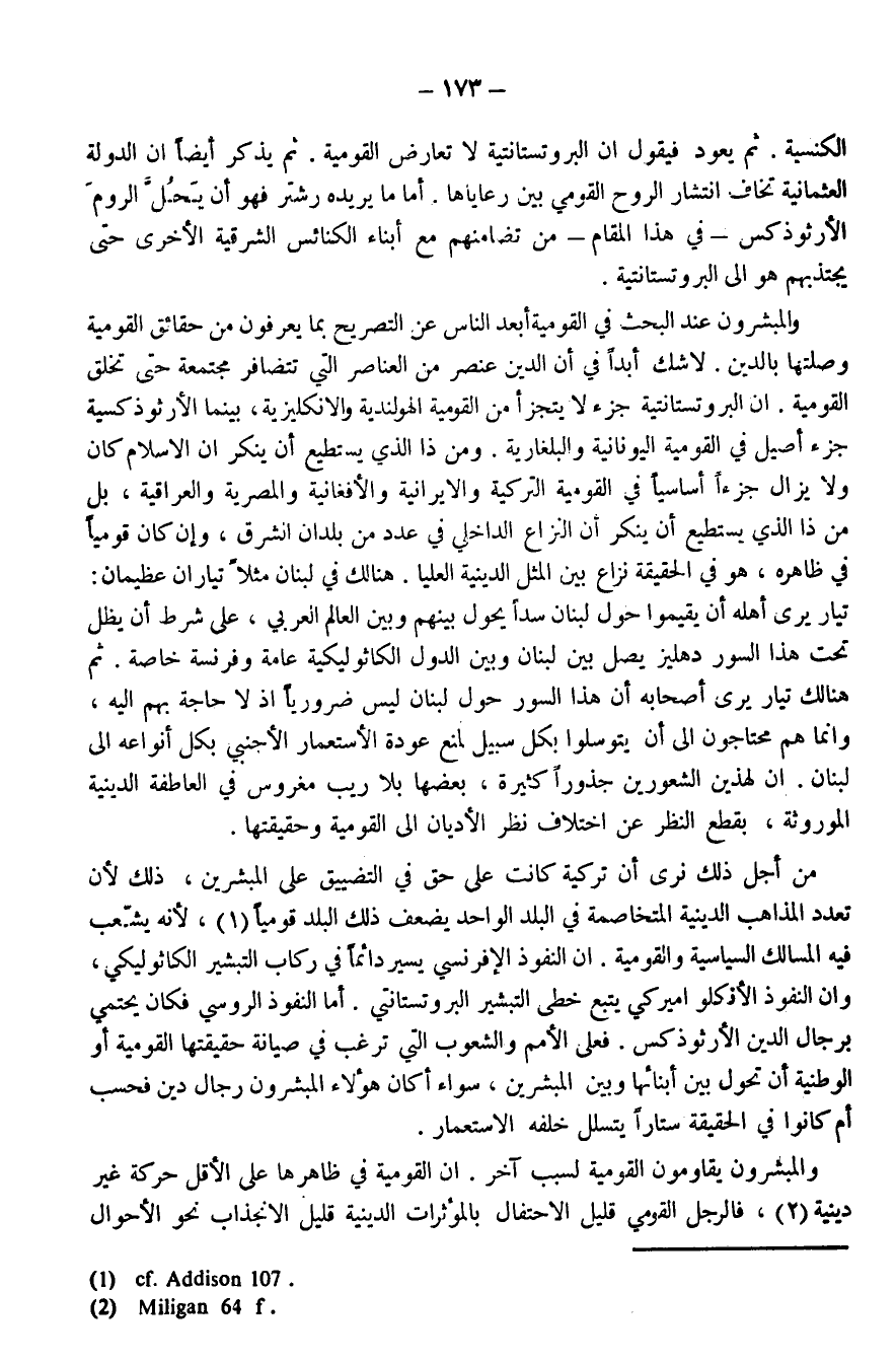 والمبشرون عند البحث في القومية أبعد الناس عن التصريح بما يعرفون من حقائق القومية وصلتها بالدين. لا شك أبدًا في أن الدين عنصر من العناصر التي تتضافر مجتمعة حتى تخلق القومية. إن البروتستانتية جُزْءٌ لا يتجزأ من القومية الهولندية والإنكليزية، بينما الأرثوذكسية جُزْءٌ أصيل في القومية اليونانية والبلغارية. ومن ذا الذي يستطيع أن ينكر أن الإسلام كان ولا يزال جُزْءًا أساسيًا في القومية التركية والإيرانية والأفغانية والمصرية والعراقية، بل من ذا الذي يستطيع أن ينكر أن النزاع الداخلي في عدد من بلدان الشرق، وإن كان قوميًا في ظاهره، هو في الحقيقة نزاع بين المثل الدينية العليا. هنالك في لبنان مثلاً تياران عظيمان: تيار يرى أهله أن يقيموا حول لبنان سُدًّا يحول بينهم وبين العالم العربي، على شرط أن يظل تحت السور دهليز يصل بين لبنان وبين الدول الكاثوليكية عامة وفرنسا خاصة. ثم هنالك تيار يرى أصحابه أن هذا السور حول لبنان ليس ضروريًا إذ لا حاجة بهم إليه، وإنما هم محتاجون إلى أن يتوسلوا بكل سبيل لمنع عودة الاستعمار الأجنبي بكل أنواعه إلى لبنان. إن لهذين الشعورين جذورًا كثيرة، بعضها بلا ريب مغروس في العاطفة الدينية الموروثة، بقطع عن اختلاف نظر الأديان إلى القومية وحقيقتها.