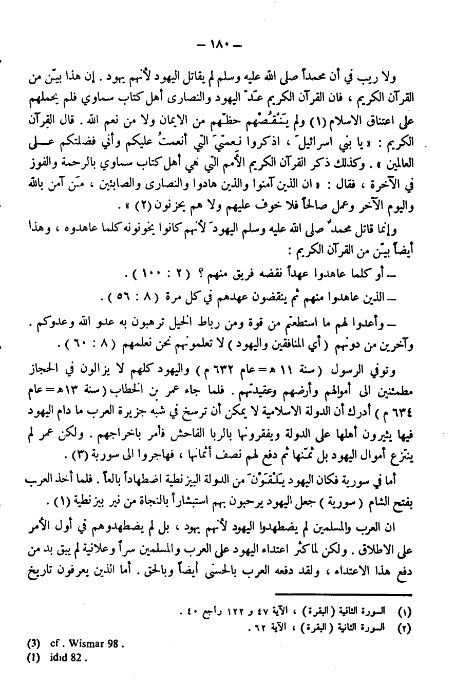 ولا ريب في أن محمدًا - صَلَّى اللهُ عَلَيْهِ وَسَلَّمَ - لم يقاتل اليهود لأنهم يهود. إن هذا بَيِّنٌ من " القرآن الكريم "، فإن " القرآن الكريم " عَدَّ اليَهُودَ وَالنَّصَارَى أهل كتاب سماوي فلم يحملهم على اعتناق الإسلام (¬1) ولم ينقصهم حظهم من الإيمان ولا من نعم الله. قال " القرآن الكريم ": {يَا بَنِي إِسْرَائِيلَ اذْكُرُوا نِعْمَتِيَ الَّتِي أَنْعَمْتُ عَلَيْكُمْ وَأَنِّي فَضَّلْتُكُمْ عَلَى الْعَالَمِينَ} [البقرة: 47 و 122]. وكذلك ذكر " القرآن الكريم " الأمم التي هي أهل كتاب سماوي بالرحمة والفوز في الآخرة، فقال: {إِنَّ الَّذِينَ آمَنُوا وَالَّذِينَ هَادُوا وَالنَّصَارَى وَالصَّابِئِينَ مَنْ آمَنَ بِاللَّهِ وَالْيَوْمِ الآخِرِ وَعَمِلَ صَالِحًا فَلَهُمْ أَجْرُهُمْ عِنْدَ رَبِّهِمْ وَلاَ خَوْفٌ عَلَيْهِمْ وَلاَ هُمْ يَحْزَنُونَ} (¬2).