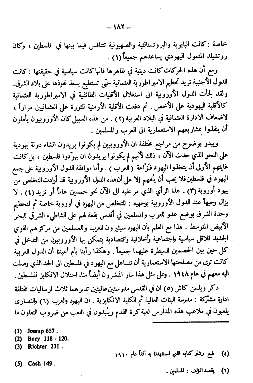 ويبدو بوضوح من مراجع مختلفة أن الأوروبيين لم يكونوا يريدون إنشاء دولة يهودية على النحو الذي حدث الآن، ذلك لأنهم لم يكونوا يريدون أَنْ يُهَوِّدُوا فلسطين، بل كانت غايتهم الأولى أن يتخذوا اليهود فَزَّاعَةً (للعرب). وأما موافقة الدول الأوروبية على جمع اليهود في فلسطين فلا يجب أَنْ يُفْهَمَ إلا على أن هذه الدول الأوروبية قد أرادت التخلص من يهود أوروبا (¬3). هذا الرأي الذي مر عليه إلى الآن نحو خمسين عامًا أو يزيد (¬4). لا يزال وجيهًا عند الدول الأوروبية بوجهيه: للتخلص من اليهود في أوروبا خاصة ثم لتحطيم وحدة الشرق بوضع عدو للعرب والمسلمين في أقدس بقعة لهم على الشاطئ الشرقي للبحر الأبيض المتوسط. هذا مع العلم بأن اليهود سيثيرون للعرب وللمسلمين من مركزهم القوي الجديد قلاقل سياسية واجتماعية وأخلاقية واقتصادية يتمكن بها الأوروبيون من التدخل في كل حين بين الخصمين للسيطرة عليهما جميعًا. وهكذا رأينا بأم أعيننا أن الدول الغربية كانت ترى من مصلحتها الاستعمارية أن تتساهل مع اليهود في فلسطين إلى الحد الذي وصلت إليه معهم في عام 1948. وعلى مثل هذا سار المبشرون أيضًا منذ احتلال الإنجليز لفلسطين.