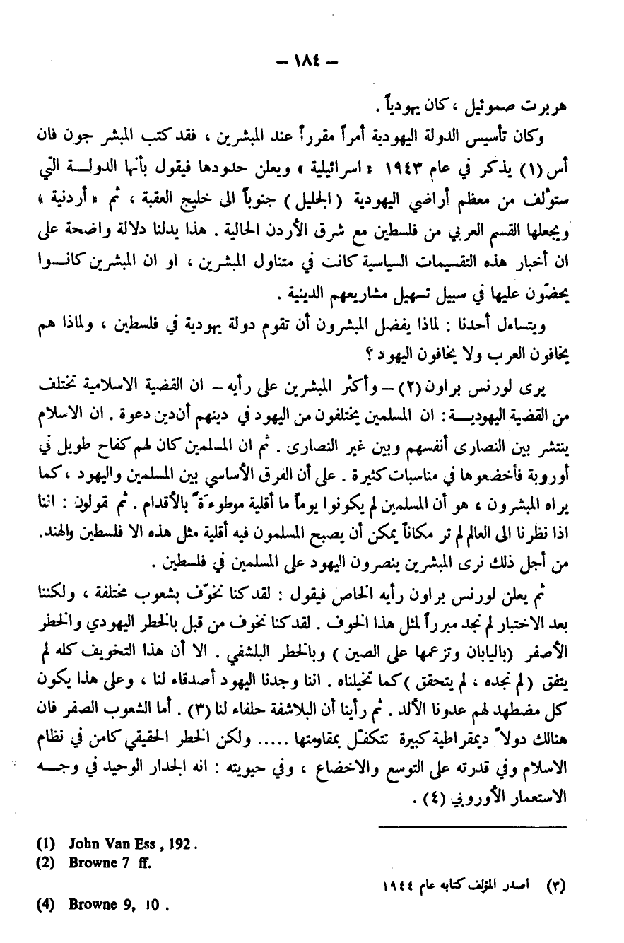 يرى (لورنس براون) (¬2) - وأكثر المبشرين على رأيه - أن القضية الإسلامية تختلف من القضية اليهودية: أن المسلمين يختلفون من اليهود في دينهم [أنه] دين دعوة. إن الإسلام ينتشر بين النصارى أنفسهم وبين غير النصارى. ثم إن المسلمين كان لهم كفاح طويل في أوروبا فأخضعوها في مناسبات كثيرة. على أن الفرق الأساسي بين المسلمين واليهود، كما يراه المبشرون، هو أن المسلمين لم يكونوا يومًا ما أقلية مَوْطُوءَةً بالأقدام. ثم يقولون: إننا إذا نظرنا إلى العالم لم نر مكانًا يمكن أن يصبح المسلمون فيه أقلية مثل هذه إلا فلسطين والهند. من أجل ذلك نرى المبشرين ينصرون اليهود على المسلمين في فلسطين.
