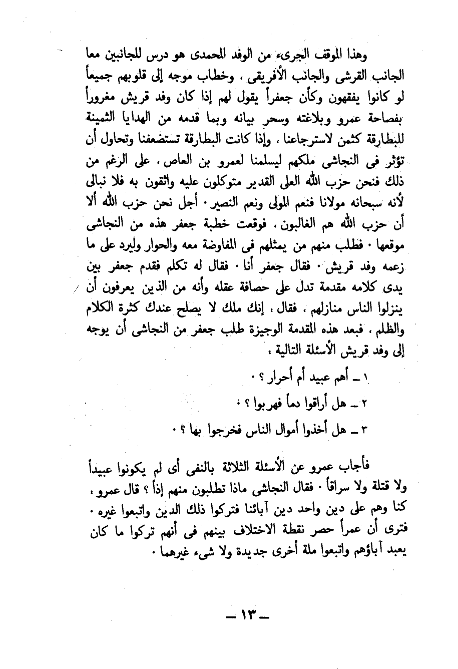 فأجاب عمرو عن الأسئلة الثلاثة بالنفي أي لم يكونوا عبيدا ولا قتلة ولا سراقا. فقال النجاشي ماذا تطلبون منهم إذا؟ قال عمرو كنا وهم على دين واحد دين آبائنا فتركوا ذلك الدين واتبعوا غيره. فترى أن عمرا حصر نقطة الاختلاف بينهم في أنهم تركوا ما كان يعبد آباؤهم واتبعوا ملة أخرى جديدة ولا شيء غيرهما.