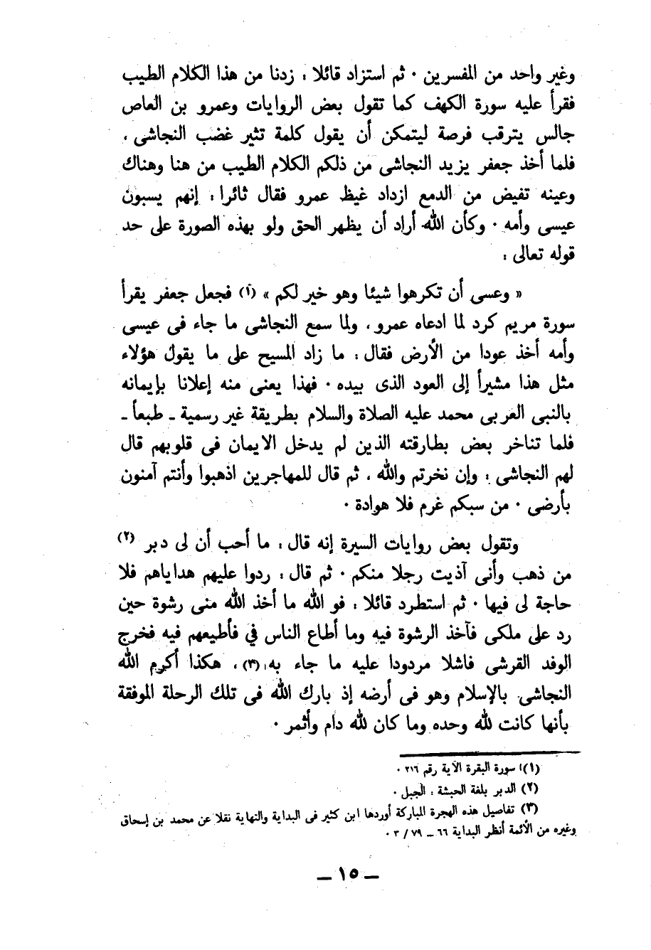 وغير واحد من المفسرين. ثم استزاد قائلا زدنا في هذا الكلام الطيب فقرأ عليه سورة الكهف كما تقول بعض الروايات وعمرو بن العاص جالس يترقب فرصة ليتمكن أن يقول كلمة تثير النجاشي، فلما أخذ جعفر يزيد النجاشي من ذلكم الكلام الطيب من هنا وهناك وعينه تفيض من الدمع ازداد غيظ عمرو فقال ثائرا: إنهم يسبون عيسى وأمه. وكأن الله أراد أن يظهر الحق ولو بهذه الصورة على حد قوله تعالى: {وَعَسَى أَنْ تَكْرَهُوا شَيْئاً وَهُوَ خَيْرٌ لَكُمْ} 1 فجعل جعفر يقرأ سورة مريم كرد لما ادعاه عمرو، ولما سمع النجاشي ما جاء في عيسى وأمه أخذ عودا من الأرض فقال:"ما زاد المسيح على ما يقول هؤلاء مثل هذا مشيرا إلى العود الذي بيده. فهذا يعني منه إعلانا بإيمانه بالنبي العربي محمد عليه الصلاة والسلام بطريقة غير رسمية- طبعا- فلما تناخر بعض بطارقته الذين لم يدخل الإيمان في قلوبهم قال لهم النجاشي: وإن نخرتم والله، ثم قال للمهاجرين اذهبوا وأنتم آمنون بأرضي. من سبكم غرم فلا هوادة.