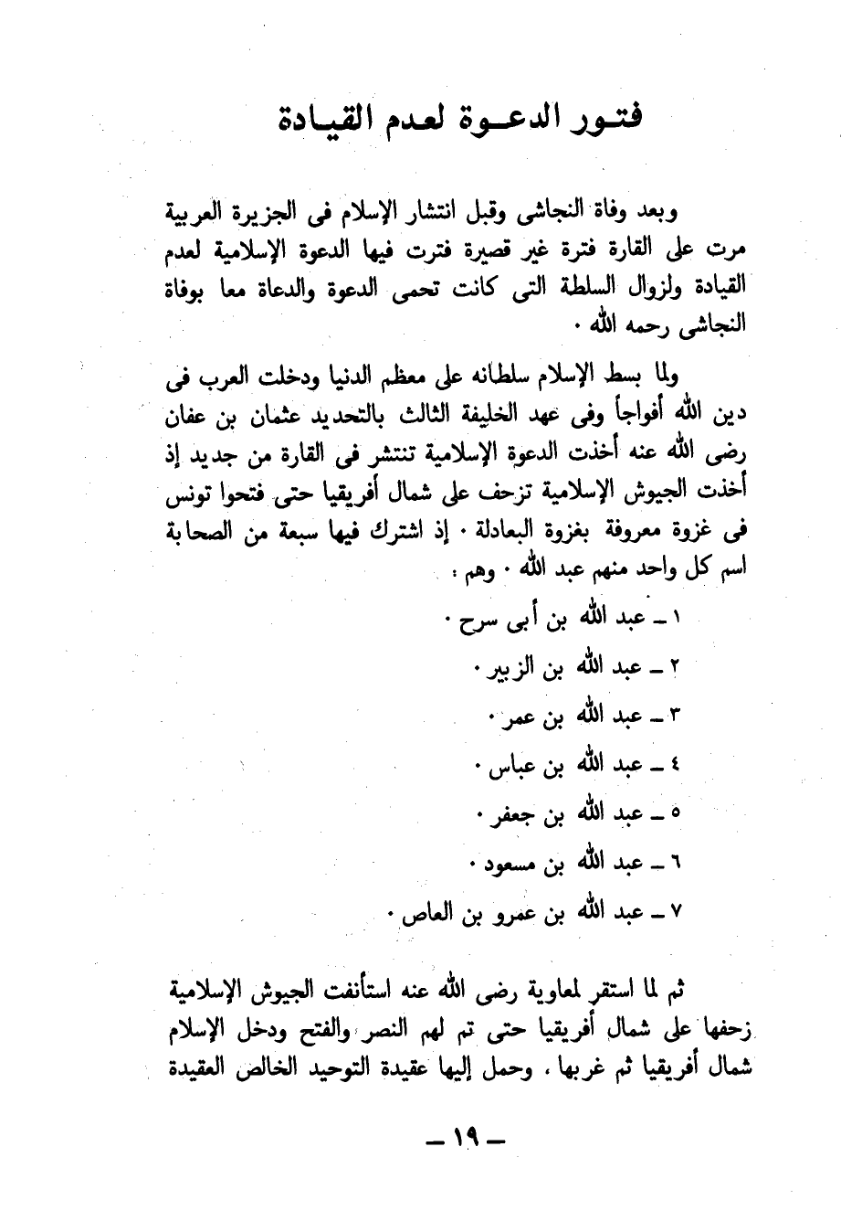 ولما بسط الإسلام سلطانه على معظم الدنيا ودخلت العرب في دين الله أفواجا وفى صدر الخليفة الثالث بالتحديد عثمان بن عفان رضي الله عنه أخذت الدعوة الإسلامية تنتشر في القارة من جديد إذ أخذت الجيوش الإسلامية تزحف على شمال أفريقيا حتى فتحوا تونس في غزوة معروفة بغزوة العبادلة. إذ اشترك فيها سبعة من الصحابة اسم كل واحد منهم عبد الله. وهم: