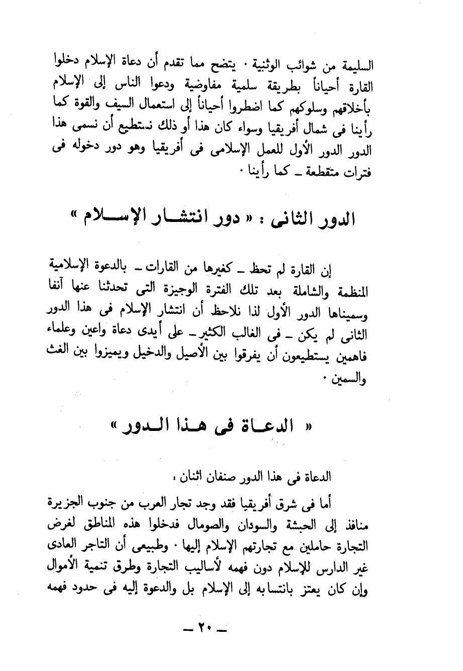 السليمة من شوائب الوثنية " يتضح مما تقدم أن دعاة الإسلام دخلوا القارة أحيانا بطربقة سليمة مفاوضية ودعوا الناس إلى الإسلام بأخلاقهم وسلوكهم كما اضطروا أحيانا إلى استعمال السيف والقوة كما رأينا في شمال أفريقيا وسواء كان هذا أو ذلك نستطيع أن نسمى هذا الدور الدور الأول للعمل الإسلامي في أفريقيا وهو دور دخوله في فترات متقطعة- كما رأيناه.