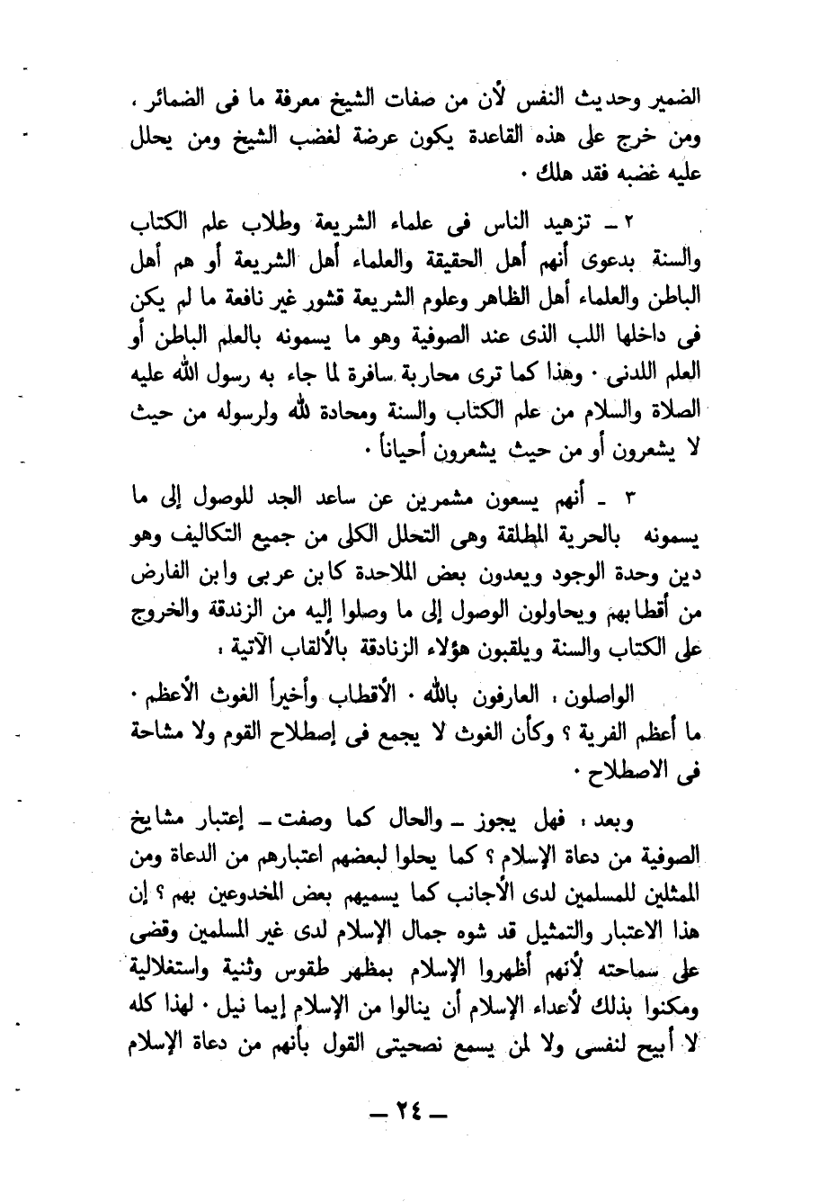 وبعدا فهل يجوز والحال كما وصافت اعتبار مشايخ الصوفية من دعاة الإسلام كما يحلوا لبعضهم اعتبارهم من الدعاة ومن الممثلين للمسلمين لدى الأجانب كما يسميهم بعض المخدوعين بهم؟ إن هذا الاعتبار والتمثيل قد شوه جمال الإسلام لدى غير المسلمين وقضى على سماحته لأنهم أصروا الإسلام بمظهر طقوس وثنية واستغلالية. ومكنوا بذلك لأعداء الإسلام أن ينالوا من الإسلام أيما نيل. لهذا كله لا أبيح لنفسي ولا لمن يسمع نصحيتي القول بأنهم من دعاة الإسلام