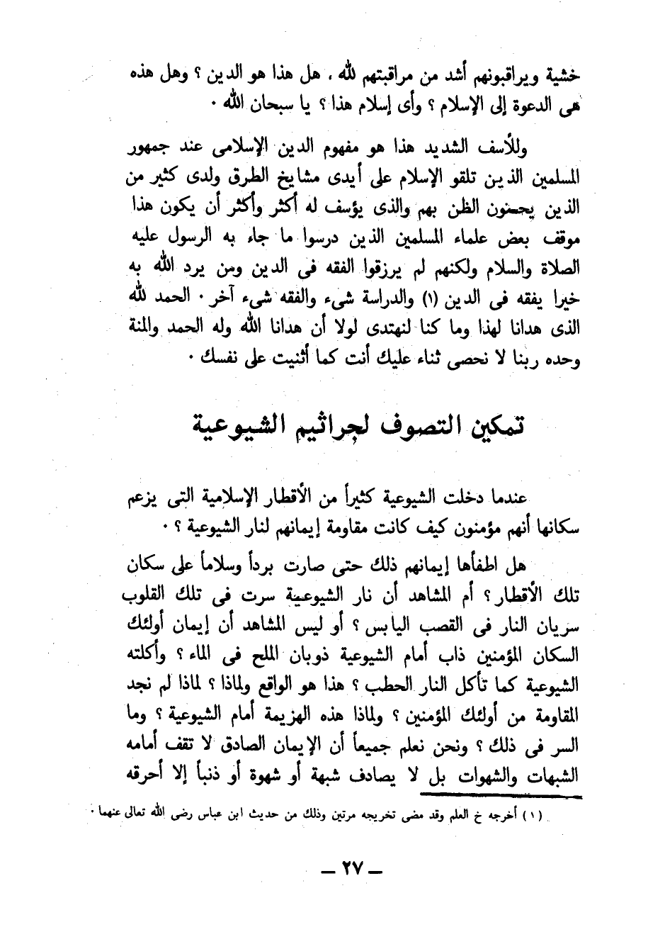 وللأسف الشديد هذا هو مفهوم الدين ا! سلأمى عند جمهور المسلمين الذين تلقو ا! سلأم على أيدى مشايخ الطرق ولدى كثير من الذين يحضون الظن بهم والذي يؤسف له كر ولثر أن يكون هذا موقف بض علماء المسلمين الذين درسوا ما جاء، به الرسول عليه الصلاة والسلام ولكنهم لم يرزقوا الفقه في الدين وثن يرد الله به خيرا يفقه في الدين1 والدراسة شىء والفقه شىء آخر. الحمد لله الذي هدانا لهذا وما كنا لنهتد لولا أن هدانا الله ولله الحمد والمنة وحده ربنا لا نحصى ثناء عليك أنت كما أثنيت على نفسك.