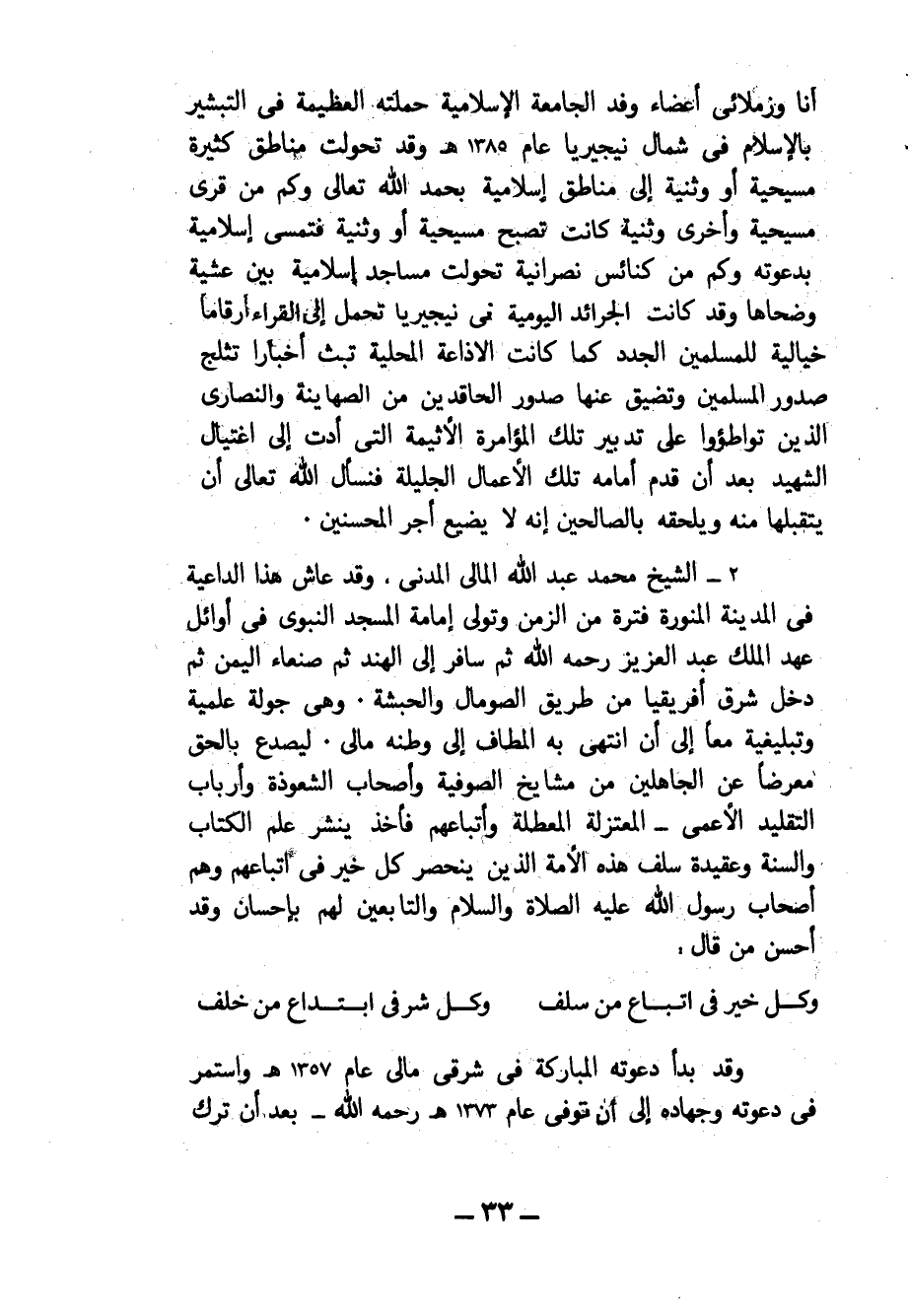 أنا وزملائي أعضاء وفد الجامعة الإسلامية حملته العظيمة في الثبشير بالإسلام في شمال نيجيريا عام 1385هـ وقد تحولت مناطق كثيرة مسيحية أو وثنية إلى مناطق إسلامية بحمد الله تعالى وكم من قرى مسيحية وأخرى وثنية كانت تصبح مسيحية أو وثنية وتمسى إسلامية بدعوته وكم من كنائس نصرانية تحولت مساجد إسلامية بين عشية وضحاها وقد كانت الجرائد اليومية في نيجيريا تحمل إلى القراء أرقاما خيالية للمسلمين الجدد كما كانت الإذاعة المحلية تبث أخبارا تثلج صدور المسلمين وتضيق عنها صدور الحاقدين من الصهاينة والنصارى الذين تواطؤوا على تدبير تلك المؤامرة الأثيمة التي أدت إلى اغتيال الشهيد بعد أن قدم أمامه تلك الأعمال الجليلة فنسأل الله تعالى أن يتقبلها منه ويلحقه بالصالحين إنه لا يضيع أجر المحسنين.