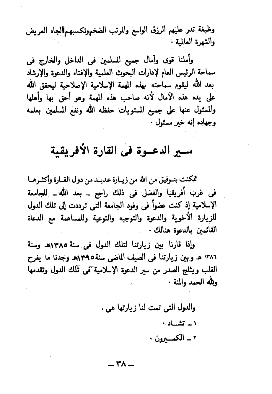 وإذا قارنا بين زيارتنا لتلك الدول في سنة 1385هـ وسنة 1386 هـ وبين زيارتنا في الصيف الماضي سنة 1395هـ وجدنا ما يفرح القلب ويثلج الصدر من سير الدعوة الإسلامية فى تلك الدول وتقدمها ولله الحمد والمنة.