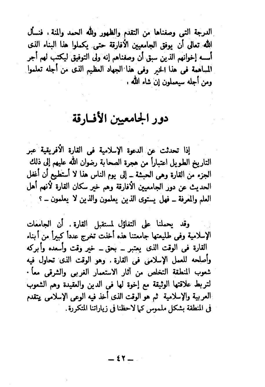 الدرجة التي وصفناها من التقدم والظهور ولله الحمد والمنة. فنسأل الله تعالى أن يوفق الجامعيين الأفارقة حتى يكملوا هذا البناء الذي أسسه إخوانهم الذين سبق أن وصفناهم إنه ولي التوفيق ليكتب لهم أجر المساهمة في هذا الخير وفي هذا الجهاد العظيم الذي من أجله تعلموا ومن أجله سيعملون إن شاء الله.