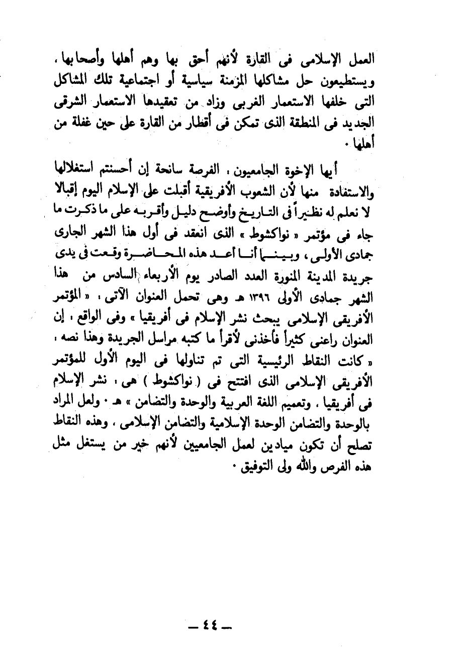 أيها الإخوة الجامعيون الفرصة سانحة إن أحسنتم استغلالها والاستفادة منها لأن الشعوب الأفريقية أقبلت على. الإسلام اليوم إقبالا لم نعلم له نظير في التاريخ وأوضح دليل وأقربه على ما ذكرت ما جاء في مؤتمر "نواكشوط" الذي انعقد في أول هذا الشهر الجاري جمادى الأولى، وبينما أنا أعد هذه المحاضرة وقعت في يدي جريدة المدينة المنورة العدد الصادر يوم الأربعاء السادس من هذا الشهر جمادى الأولى 1396هـ وهي تحمل العنوان الآتي: "المؤتمر الإفريقي الإسلامي يبحث نشر الإسلام في أفريقيا وفي الواقع إن العنوان راعني كثيرا فأخذني لأقرأ ما كتبه مراسل الجريدة وهذا نصه، "كانت القاعة الرئيسية التي تم تناولها في اليوم الأول للمؤتمر الأفريقي الإسلامي الذي افتتح في (نواكشوط) هي: "نشر الإسلام في أفريقيا، وتعميم اللغة العربية والوحدة والتضامن" هـ