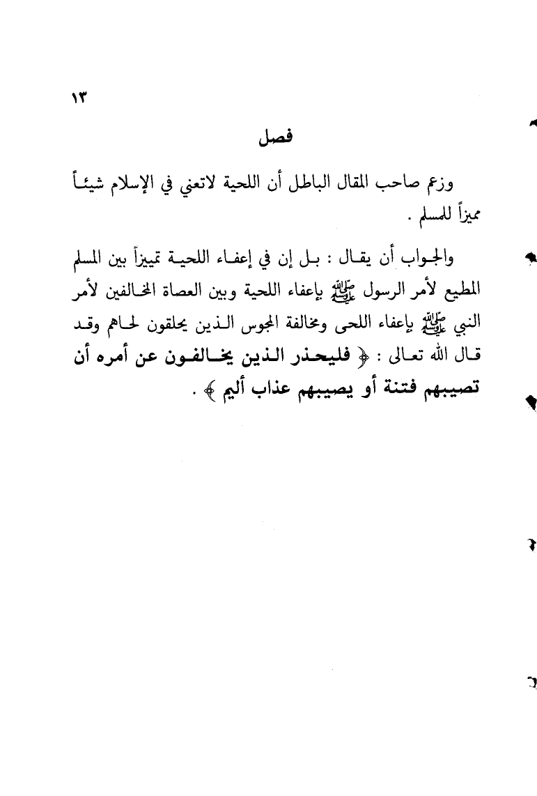 والجواب أن يقال: بل إن في إعفاء اللحية تمييزًا بين المسلم المطيع لأمر الرسول - صلى الله عليه وسلم - بإعفاء اللحية، وبين العصاة المخالفين لأمر النبي - صلى الله عليه وسلم - بإعفاء اللحى، ومخالفة المجوس الذين يحلقون لحاهم، وقد قال الله تعالى: {فَلْيَحْذَرِ الَّذِينَ يُخَالِفُونَ عَنْ أَمْرِهِ أَنْ تُصِيبَهُمْ فِتْنَةٌ أَوْ يُصِيبَهُمْ عَذَابٌ أَلِيمٌ}.