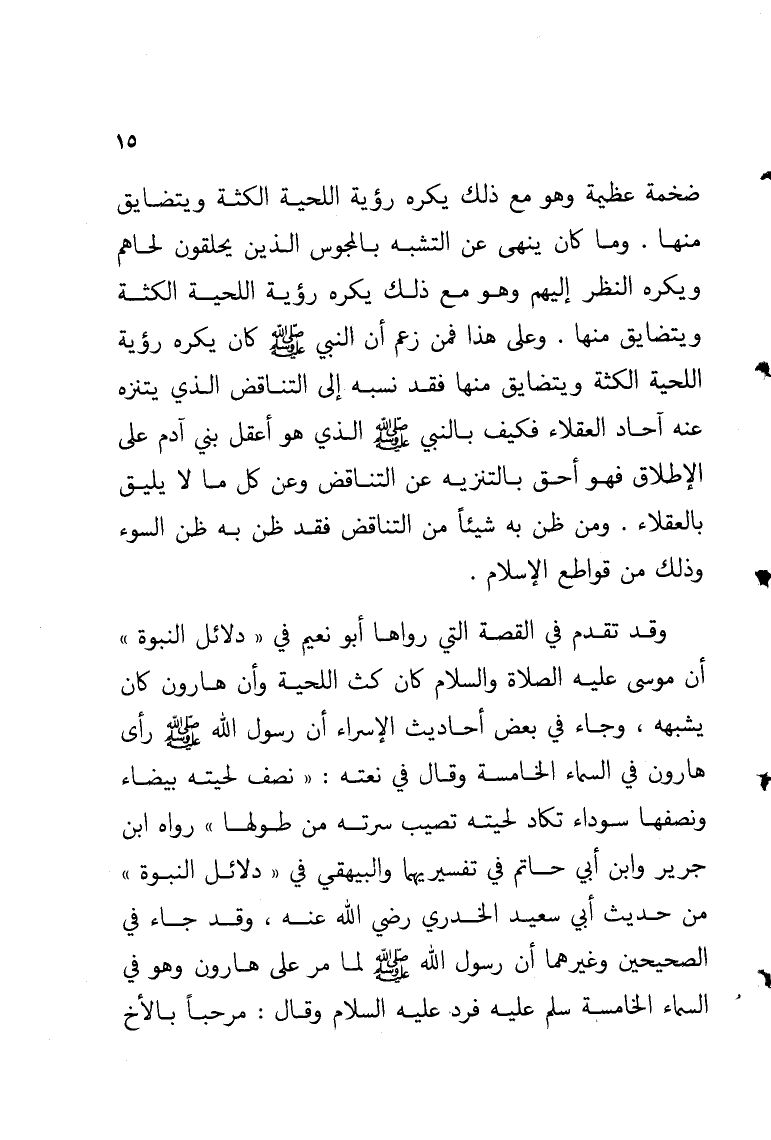 ضخمة عظيمة، وهو مع ذلك يكره رؤية اللحية الكثة ويتضايق منها. وما كان ينهى عن التشبه بالمجوس الذين يحلقون لحاهم ويكره النظر إليهم وهو مع ذلك يكره رؤية اللحية الكثة ويتضايق منها. وعلى هذا فمن زعم أن النبي - صلى الله عليه وسلم - كان يكره رؤية اللحية الكثة ويتضايق منها فقد نسبه إلى التناقض الذي يتنزه عنه آحاد العقلاء، فكيف بالنبي - صلى الله عليه وسلم - الذي هو أعقل بني آدم على الإطلاق، فهو أحق بالتنزيه عن التناقض وعن كل ما لا يليق بالعقلاء. ومن ظن به شيئًا من التناقض فقد ظن به ظن السوء، وذلك من قواطع الإسلام.