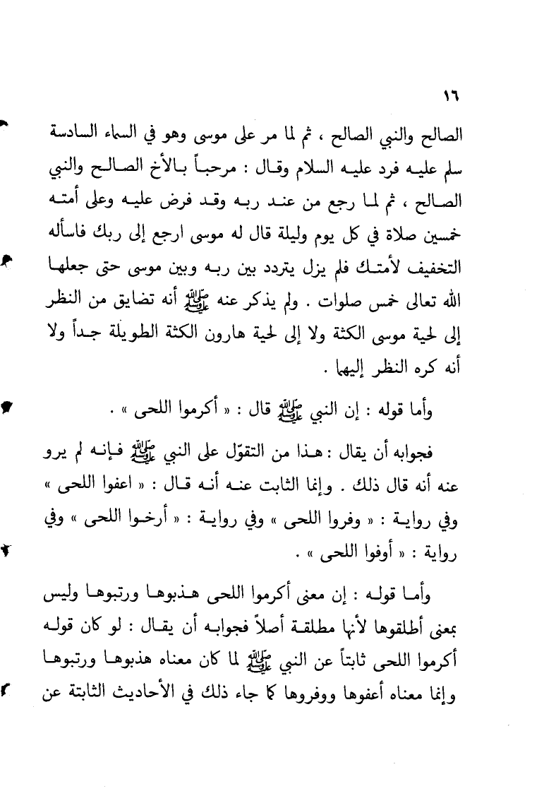 الصالح والنبي الصالح، ثم لما مر على موسى وهو في السماء السادسة سلم عليه فرد عليه السلام وقال: مرحبًا بالأخ الصالح والنبي الصالح، ثم لما رجع من عند ربه وقد فرض عليه وعلى أمته خمسين صلاة في كل يوم وليلة، قال له موسى: ارجع إلى ربك فاسأله التخفيف لأمتك فلم يزل يتردد بين ربه وبين موسى حتى جعلها الله تعالى خمس صلوات. ولم يذكر عنه - صلى الله عليه وسلم - أنه تضايق من النظر إلى لحية موسى الكثة، ولا إلى لحية هارون الكثة الطويلة جدًا، ولا أنه كره النظر إليهما.