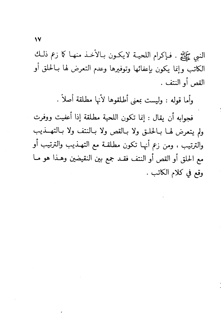 فجوابه أن يقال: إنما تكون اللحية مطلقة إذا أعفيت ووفرت، ولم يتعرض لها بالحلق، ولا بالقص، ولا بالنتف، ولا بالتهذيب والترتيب، ومن زعم أنها تكون مطلقة مع التهذيب والترتيب، أو مع الحلق أو القص، أو النتف، فقد جمع بين النقيضين وهذا هو ما وقع في كلام الكاتب.
