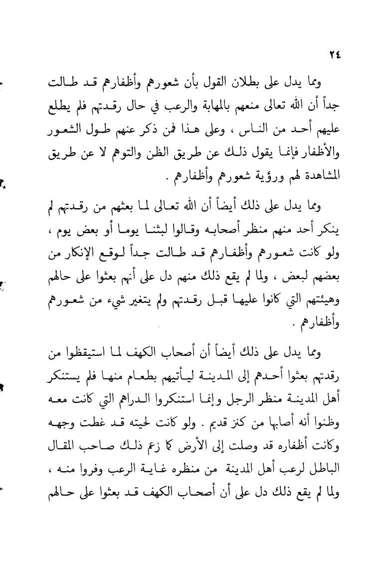 ومما يدل على ذلك أيضًا أن الله تعالى لما بعثهم من رقدتهم لم ينكر أحد منهم منظر أصحابه، وقالوا لبثنا يوما أو بعض يوم، ولو كانت شعورهم وأظفارهم قد طالت جدًا لوقع الإنكار من بعضهم لبعض، ولما لم يقع ذلك منهم دل على أنهم بعثوا على حالهم وهيئتهم التي كانوا عليها قبل رقدتهم، ولم يتغير شيء من شعورهم وأظفارهم.