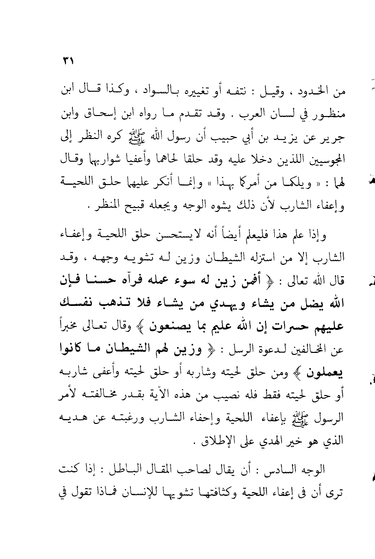 من الخدود، وقيل: نتفقه أو تغييره بالسواد، وكذا قال ابن منظور في لسان العرب. وقد تقدم ما رواه ابن إسحاق، وابن جرير عن يزيد بن أبي حبيب أن رسول الله - صلى الله عليه وسلم - كره النظر إلى المجوسيين اللذين دخلا عليه، وقد حلقا لحاهما، وأعفيا شواربهما، وقال لهما: «ويلكما، من أمركما بهذا؟»، وإنما أنكر عليهما حلق اللحية وإعفاء الشارب؛ لأن ذلك يشوه الوجه ويجعله قبيح المنظر.