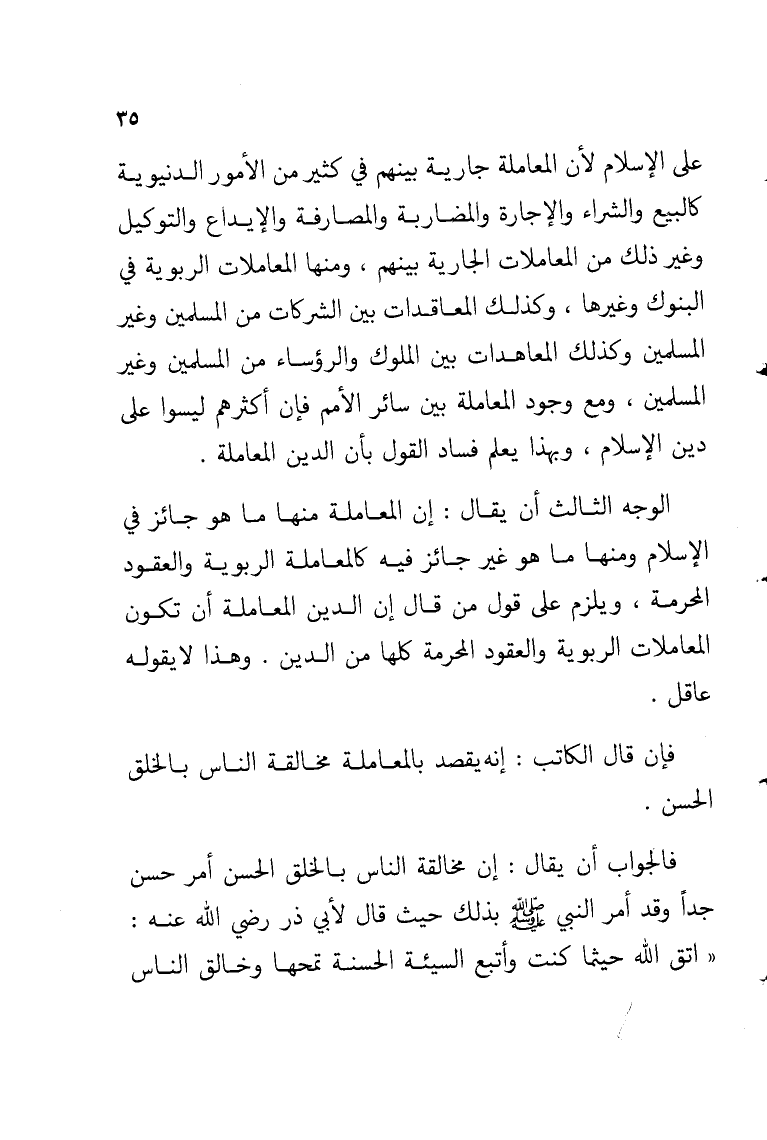 الوجه الثالث أن يقال: إن المعاملة منها ما هو جائز في الإسلام، ومنها ما هو غير جائز فيه كالمعاملة الربوبية، والعقود المحرمة، ويلزم على قول من قال إن الدين المعاملة أن تكون المعاملات الربوية والعقود المحرمة كلها من الدين. وهذا لا يقوله عاقل.