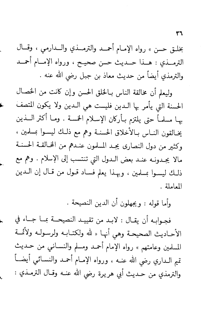 وليعلم أن مخالقة الناس بالخلق الحسن، وإن كانت من الخصال الحسنة التي يأمر بها الدين فليست هي الدين، ولا يكون المتصف بها مسلمًا حتى يلتزم بأركان الإسلام الخمسة. وما أكثر الذين يخالقون الناس بالأخلاق الحسنة، وهم مع ذلك ليسوا بمسلمين، وكثير من دول النصارى يجد المسلمون عندهم من المخالقة الحسنة ما لا يجدونه عند بعض الدول التي تنتسب إلى الإسلام. وهم مع ذلك ليسوا بمسلمين، وبهذا يعلم فساد قول من قال إن الدين المعاملة.