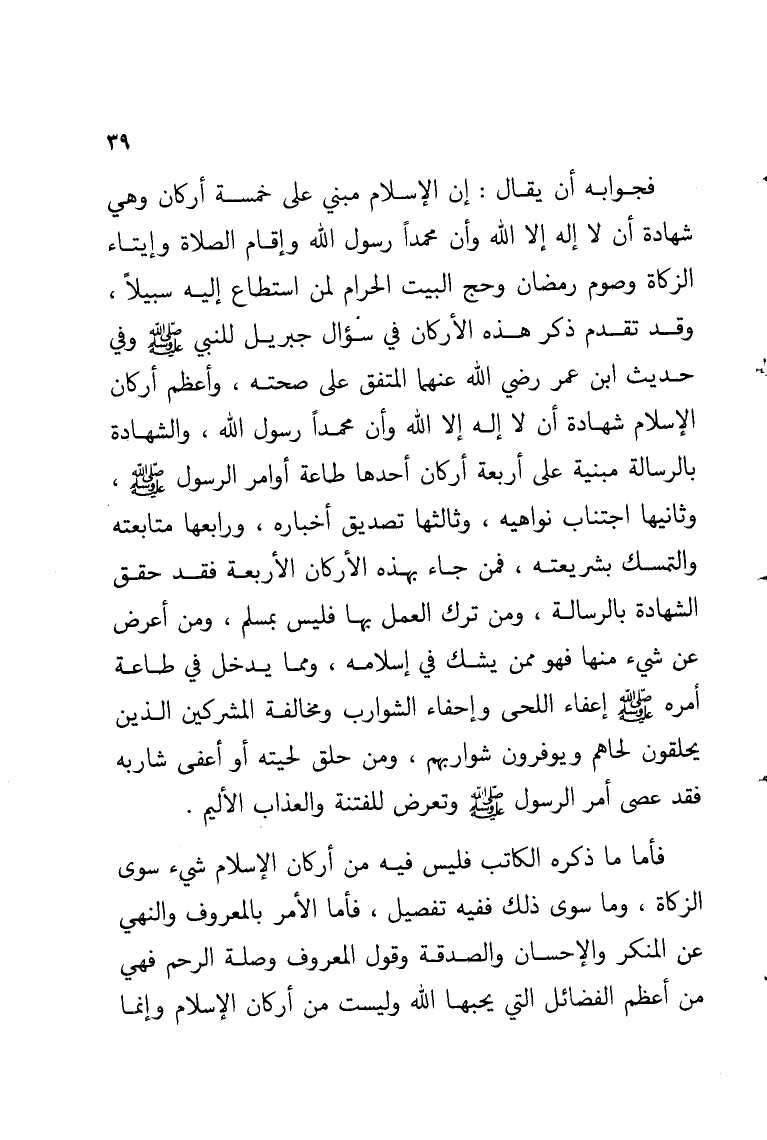 فجوابه أن يقال: إن الإسلام مبني على خمسة أركان: وهي شهادة أن لا إله إلا الله وأن محمدًا رسول الله، وإقام الصلاة، وإيتاء الزكاة، وصوم رمضان، وحج البيت الحرام لمن استطاع إليه سبيلاً، وقد تقدم ذكر هذه الأركان في سؤال جبريل للنبي - صلى الله عليه وسلم - وفي حديث ابن عمر رضي الله عنهما المتفق على صحته، وأعظم أركان الإسلام شهادة أن لا إله إلا الله وأن محمدًا رسول الله، والشهادة بالرسالة مبنية على أربعة أركان أحدها: طاعة أوامر الرسول - صلى الله عليه وسلم -، وثانيها: اجتناب نواهيه، وثالثها: تصديق أخباره، ورابعها: متابعته والتمسك بشريعته، فمن جاء بهذه الأركان الأربعة فقد حقق الشهادة بالرسالة، ومن ترك العمل بها فليس بمسلم، ومن أعرض عن شيء منها فهو ممن يشك في إسلامه، ومما يدخل في طاعة أمره - صلى الله عليه وسلم - إعفاء اللحى، وإحفاء الشوارب، ومخالفة المشركين الذين يحلقون لحاهم ويوفرون شواربهم، ومن حلق لحيته، أو أعفى شاربه فقد عصى أمر الرسول - صلى الله عليه وسلم -، وتعرض للفتنة، والعذاب الأليم.