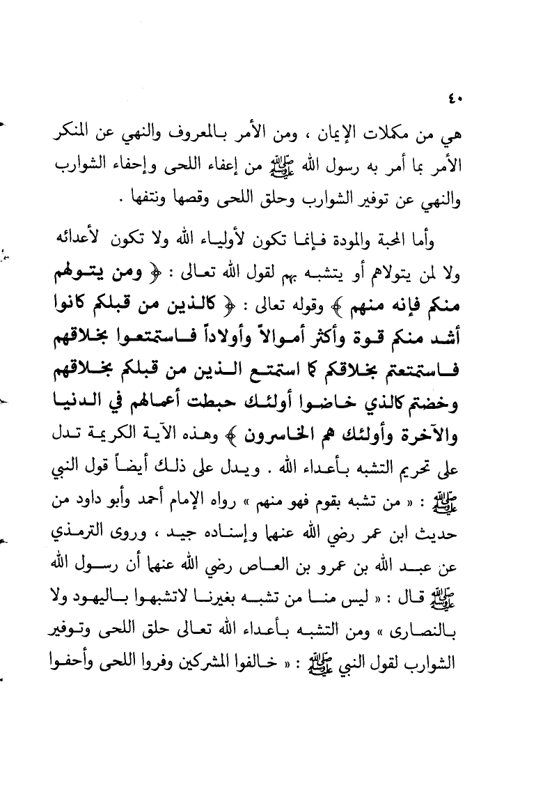 وأما المحبة والمودة فإنما تكون لأولياء الله، ولا تكون لأعدائه، ولا لمن يتولاهم، أو يتشبه بهم لقول الله تعالى: {وَمَنْ يَتَوَلَّهُمْ مِنْكُمْ فَإِنَّهُ مِنْهُمْ}، وقوله تعالى: {كَالَّذِينَ مِنْ قَبْلِكُمْ كَانُوا أَشَدَّ مِنْكُمْ قُوَّةً وَأَكْثَرَ أَمْوَالاً وَأَوْلَادًا فَاسْتَمْتَعُوا بِخَلَاقِهِمْ فَاسْتَمْتَعْتُمْ بِخَلَاقِكُمْ كَمَا اسْتَمْتَعَ الَّذِينَ مِنْ قَبْلِكُمْ بِخَلَاقِهِمْ وَخُضْتُمْ كَالَّذِي خَاضُوا أُولَئِكَ حَبِطَتْ أَعْمَالُهُمْ فِي الدُّنْيَا وَالْآَخِرَةِ وَأُولَئِكَ هُمُ الْخَاسِرُونَ}، وهذه الآية الكريمة تدل على تحريم التشبه بأعداء الله. ويدل على ذلك أيضًا قول النبي - صلى الله عليه وسلم -: «من تشبه بقوم فهو منهم» رواه الإمام أحمد، وأبو داود من حديث ابن عمر رضي الله عنهما وإسناده جيد، وروى الترمذي عن عبد الله بن عمرو بن العاص رضي الله عنهما أن رسول الله - صلى الله عليه وسلم - قال: «ليس منا من تشبه بغيرنا، لا تشبهوا باليهود، ولا بالنصارى»، ومن التشبه بأعداء الله تعالى حلق اللحى وتوفير الشوارب؛ لقول النبي - صلى الله عليه وسلم -: «خالفوا المشركين، وفروا اللحى، وأحفوا