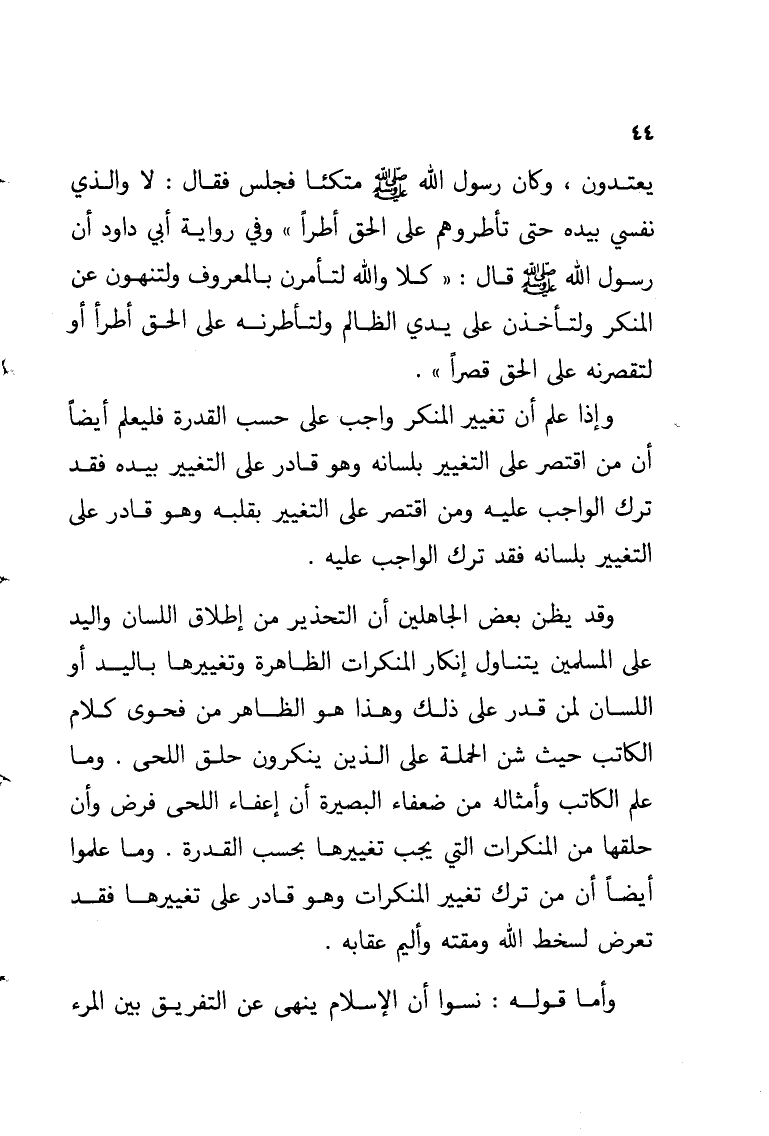 يعتدون، وكان رسول الله - صلى الله عليه وسلم - متكئًا فجلس فقال: لا والذي نفسي بيده حتى تأطروهم على الحق أطرًا»، وفي رواية أبي داود أن رسول الله - صلى الله عليه وسلم - قال: «كلا والله لتأمرن بالمعروف، ولتنهون عن المنكر، ولتأخذن على يدي الظالم، ولتأطرنه على الحق أطرًا، أو لتقصرنه على الحق قصرًا».