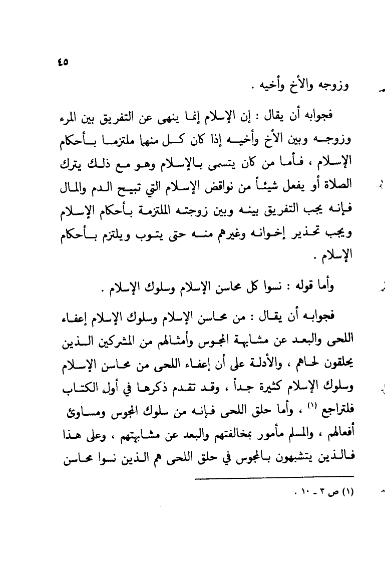 فجوابه أن يقال: إن الإسلام إنما ينهى عن التفريق بين المرء وزوجه، وبين الأخ وأخيه إذا كان كل منهما ملتزمًا بأحكام الإسلام، فأما من كان يتسمى بالإسلام وهو مع ذلك يترك الصلاة، أو يفعل شيئًا من نواقض الإسلام التي تبيح الدم والمال، فإنه يجب التفريق بينه وبين زوجته الملتزمة بأحكام الإسلام، ويجب تحذير إخوانه وغيرهم منه حتى يتوب ويلتزم بأحكام الإسلام.