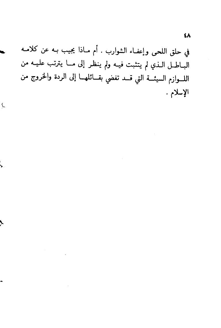 في حلق اللحى وإعفاء الشوارب. أما ماذا يجيب به عن كلامه الباطل الذي لم يتثبت فيه، ولم ينظر إلى ما يترتب عليه من اللوازم السيئة التي قد تفضي بقائلها إلى الردة والخروج من الإسلام.