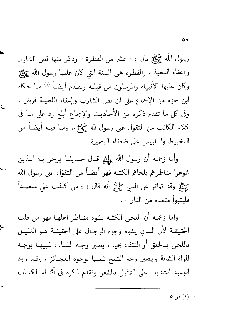 وأما زعمه أن رسول الله - صلى الله عليه وسلم - قال حديثا يزجر به الذين شوهوا مناظرهم بلحاهم الكثة، فهو أيضًا من التقول على رسول الله - صلى الله عليه وسلم -، وقد تواتر عن النبي - صلى الله عليه وسلم - أنه قال: «من كذب علي متعمدًا فليتبوأ مقعده من النار».