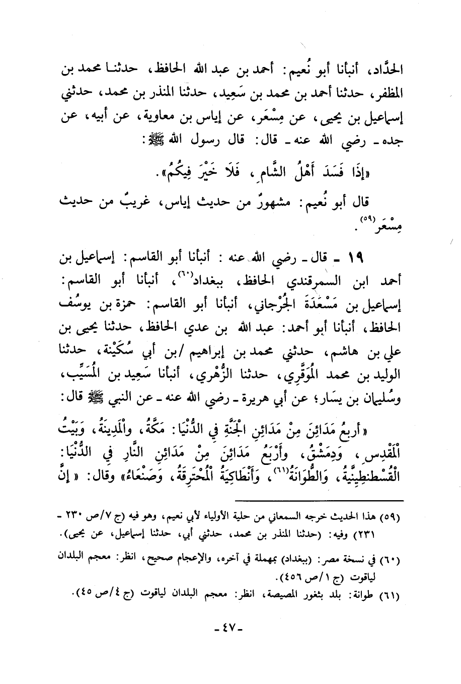 عَنِ النَّبِيِّ صَلَّى اللَّهُ عَلَيْهِ وَسَلَّمَ قَالَ أَرْبَعُ مدائن من مدائن الْجَنَّةِ فِي الدُّنْيَا مَكَّةُ وَالْمَدِينَةُ وَبَيْتُ الْمَقْدِسِ وَدِمَشْقَ وَأَرْبَعُ مَدَائِنٍ مِنْ مَدَائِنِ النَّارِ فِي الدُّنْيَا الْقُسْطَنْطِينِيَّةُ وَالطُوَانَةُ وَأَنْطَاكِيَةُ الْمُحْتَرِقَةُ وَصَنْعَاءُ