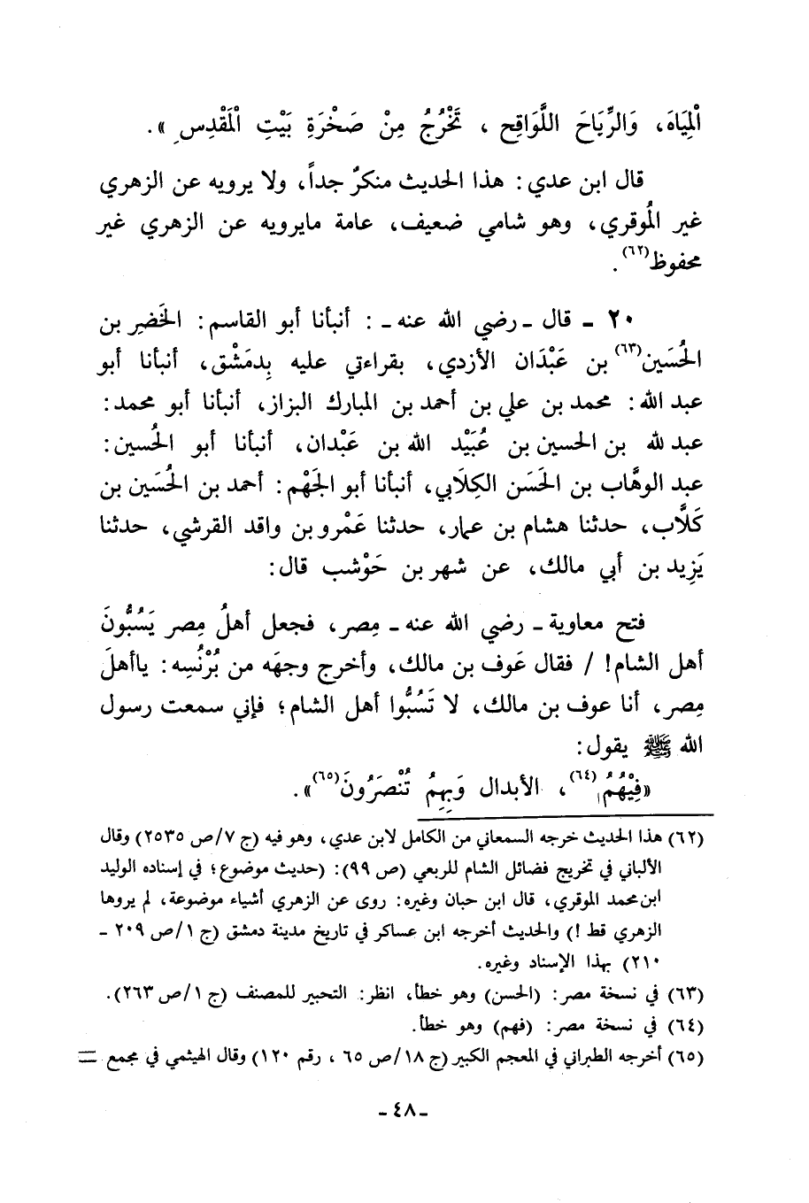 فَتَحَ مُعَاوِيَةُ رَضِيَ اللَّهُ عَنْهُ مِصْرَ فَجَعَلَ أَهْلُ مِصْرَ يَسُبُّونَ أَهْلَ الشَّامِ فَقَالَ عَوْفُ بْنُ مَالِكٍ وَأَخْرَجَ وَجْهَهُ مِنْ بُرْنُسِهِ يَا أَهْلَ مِصْرَ أَنَا عَوْفُ بْنُ مَالِكٍ لا تَسُبُّوا أَهْلَ الشَّامِ فَإِنِّي سَمِعْتُ رَسُولَ اللَّهِ صَلَّى اللَّهُ عَلَيْهِ وَسَلَّمَ يَقُولُ: فِيهِمُ الأَبْدَالُ وَبِهِمْ تُنْصَرُونَ.
