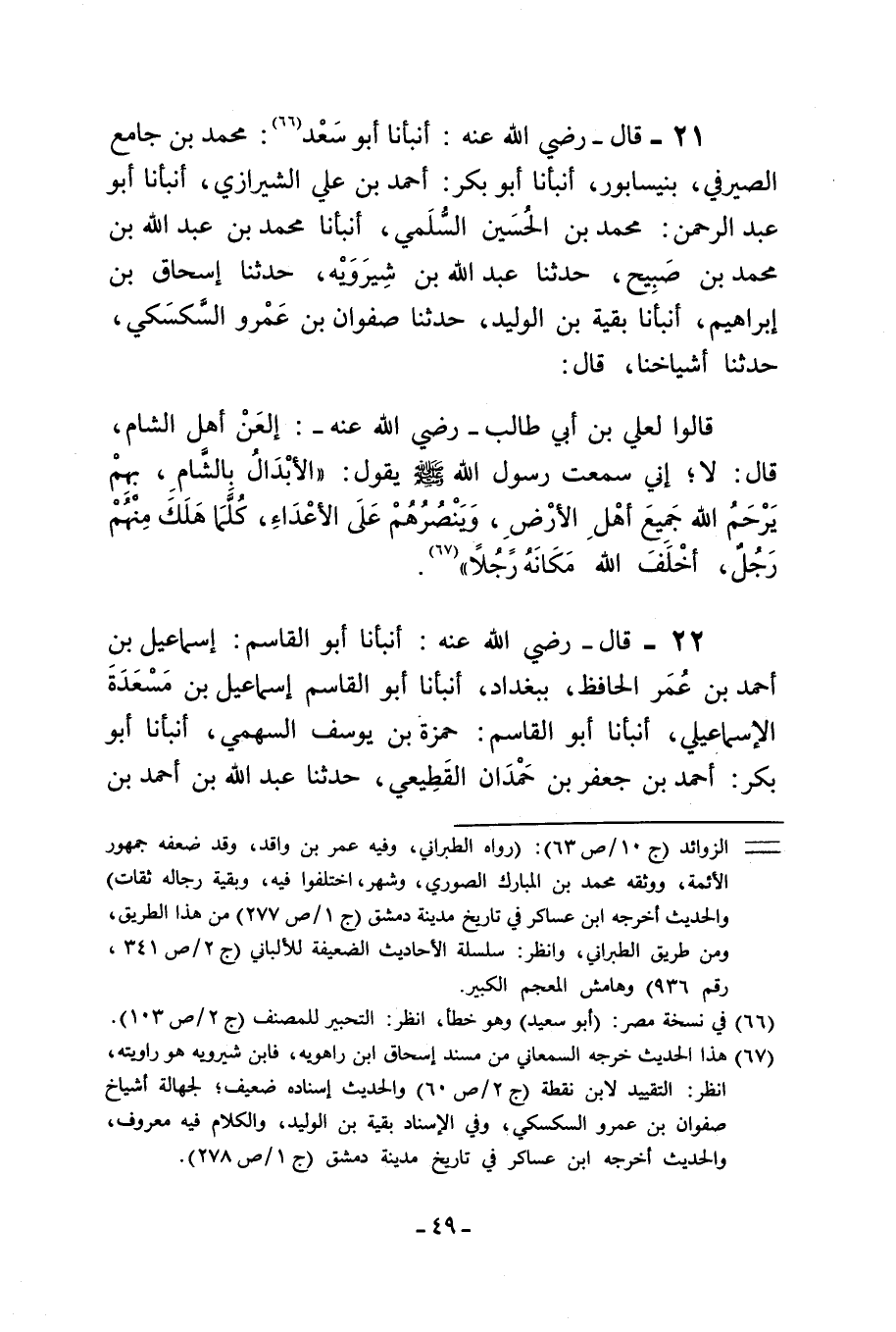 21 - قَالَ رضي الله عنه أنبأنا أَبُو سَعْدٍ مُحَمَّدُ بْنُ جَامِعٍ الصيرفي بنيسابور أنبأنا أَبُو بَكْرٍ أَحْمَدُ بْنُ عَلِيِّ الشيرازي أنبأنا أَبُو عَبْدِ الرَّحْمَنِ مُحَمَّدُ بْنُ الحسين السلمي أنبأنامحمد بْنُ عَبْدِ اللَّهِ بْنِ مُحَمَّدِ بن صبيح حدثنا عبد الله بن شيرويه حدثنا إسحاق بن إبراهيم أنبأنا بقية بن الوليد حدثنا صفوان بن عمرو السكسكي حدثنا أَشْيَاخُنَا قَالَ
