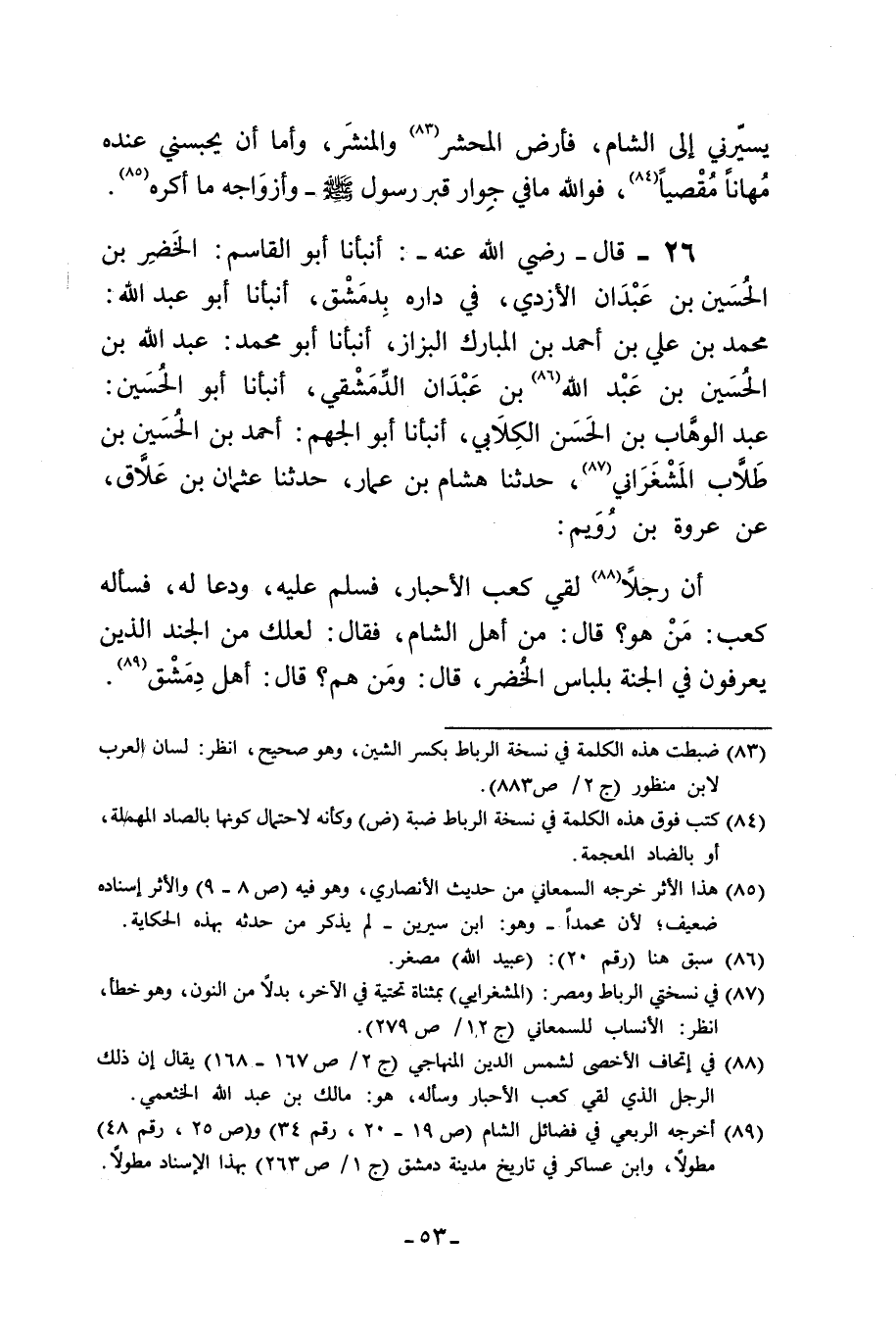26 - قَالَ رضي الله عنه أنبأنا أَبُو الْقَاسِمِ الْخَضِرُ بْنُ الْحُسَيْنِ بن عبدان الأزدي في دراه بدمشق أنبأنا أَبُو عَبْدِ اللَّهِ مُحَمَّدُ بْنُ عَلِيِّ بْنِ أَحْمَدَ بْنِ الْمُبَارَكِ البزاز أنبأنا أَبُو مُحَمَّدٍ عَبْدُ اللَّهِ بْنُ الحسين بْن عبد الله بْن عبدان الدمشقي أنبأنا أَبُو الحسين عبد الوهاب بْن الحسن الكلابي أنبأنا أَبُو الْجَهْمِ أَحْمَدُ بْنُ الْحُسَيْنِ بن طلاب المشغراني حدثنا هشام بن عمار حدثنا عثمان بْن علاق عن عروة بْن رويم