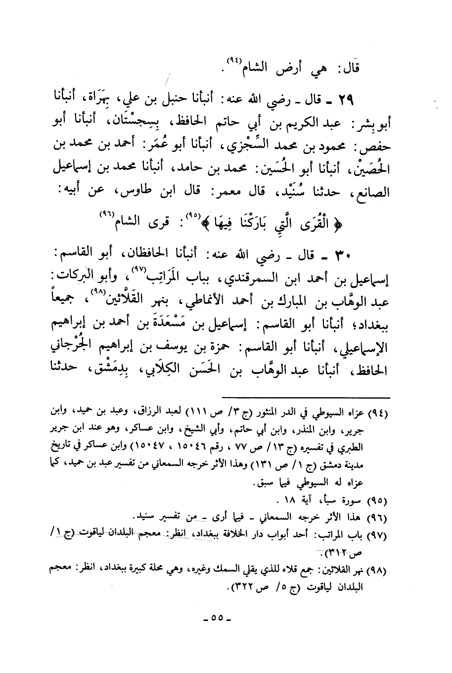 30 - قَالَ رضي الله عنه أنبأنا الحافظان أَبُو القاسم إسماعيل بْن أحمد ابن السمرقندي بباب المراتب وأبو البركات عبد الوهاب بْن المبارك بْن أحمد الأنماطي بنهر القلائين جميعاً ببغداد أنبأنا أَبُو الْقَاسِمِ إِسْمَاعِيلُ بْنُ مَسْعَدَةَ بْن أَحْمَد بْن إبراهيم الإسماعيلي أنبأنا أَبُو الْقَاسِمِ حَمْزَةُ بْنُ يُوسُفَ بن إبراهيم الجرجاني الحافظ أنبأنا عَبْدِ الْوَهَّابِ بْنِ الْحَسَنِ الْكِلابِيُّ بدمشق حدثنا -[56]- محمد بن إسماعيل الحماني حدثنا محمد بن إبراهيم حدثنا محمد بن عبد الله حدثنا الوليد بْن مسلم عن عَبْد الرَّحْمَنِ بْن ثابت بْن ثوبان قَالَ
