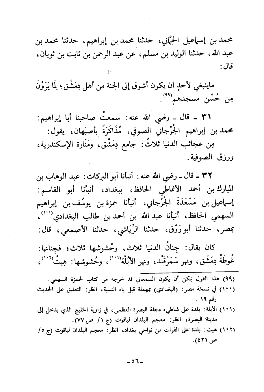 32 - قَالَ رضي الله عنه أنبأنا أَبُو الْبَرَكَاتِ عَبْدُ الْوَهَّابِ بْنُ المبارك بْن أَحْمَد الأنماطي الحافظ ببغداد أنبأنا أَبُو الْقَاسِمِ إِسْمَاعِيلُ بْنُ مَسْعَدَةَ الجرجاني أنبأنا حمزة بْن يوسف بْن إبراهيم السهمي الحافظ أنبأنا عَبْدُ اللَّهِ بْنُ أَحْمَدَ بْنِ طالب البغدادي بمصر حدثنا أبو روق حدثنا الرياشي حدثنا الأصمعي قَالَ