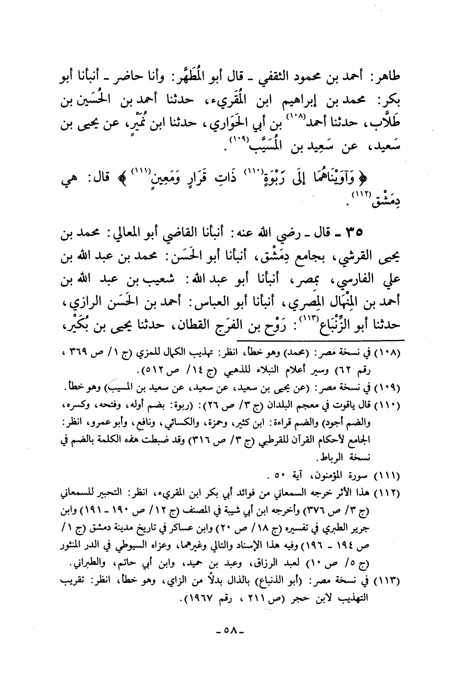 عن سعيد بن المسيب في قول الله عز وجل {وَآوَيْنَاهُمَا إِلَى رَبْوَةٍ ذَاتِ قَرَارٍ ومعين} قَالَ هي دمشق.