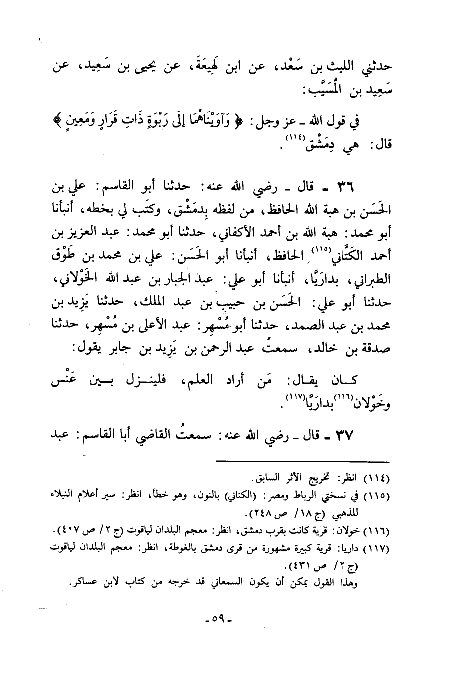 36 - قَالَ رضي الله عنه حدثنا أَبُو الْقَاسِمِ عَلِيُّ بْنُ الْحَسَنِ بْن هبة الله الحافظ من لفظه بدمشق وكتب لي بخطه أنبأنا أَبُو مُحَمَّد هبة الله بْن أحمد الأكفاني حدثنا أَبُو مُحَمَّد عبد العزيز بْن أحمد الكتاني الحافظ أنبأنا أَبُو الحسن علي بْن مُحَمَّد بن طوق الطبراني بداريا أنبأنا أَبُو علي عبد الجبار بْن عبد الله الخولاني حدثنا أبو علي الحسن بن حبيب بن عبد الملك حدثنا يزيد بْن مُحَمَّد بْن عبد الصمد حدثنا أَبُو مِسْهَرٍ عَبْدُ الأَعْلَى بْنُ مسهرحدثنا صدقة بْن خالد
