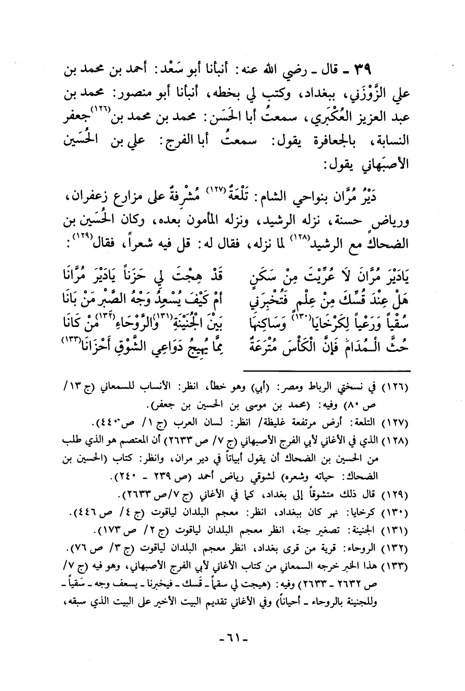 39 - قَالَ رضي الله عنه أنبأنا أَبُو سعد أَحْمَد بْن مُحَمَّد علي الزوزني ببغداد وكتب لي بخطه أنبأنا أبو منصور مُحَمَّد بْن عبد العزيز العكبري سمعت أبا الحسن مُحَمَّد بْن محمد بن جعفر النسابة بالجعافرة يقول سمعت أبا الفرج علي بْن الحسين الأصبهاني يقول دير مران بنواحي الشام تلعة مشرفة على مزارع زعفران ورياض حسنة نزله الرشيد ونزله المأمون بعده وكان الحسين بْن الضحاك مَعَ الرشيد لما نزله فَقَالَ له قل فيه شعرا فَقَالَ