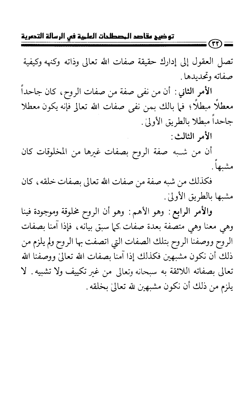 والأمر الرابع: وهو الأهم: وهو أن الروح مخلوقة وموجودة فينا وهي معنا متصفة بعدة صفات كما سبق بيانه، فإذا آمنا بصفات الروح ووصفنا الروح بتلك الصفات التي اتصفت بها الروح ولم يلزم من ذلك أن نكون من المشبهين فكذلك إذا آمنا بصفات الله تعالى ووصفنا الله تعالى بصفاته اللائقة به سبحانه وتعالى من غير تكييف ولا تشبيه. لا يلزم من ذلك أن نكون من مشبهين لله تعالى بخلقه.