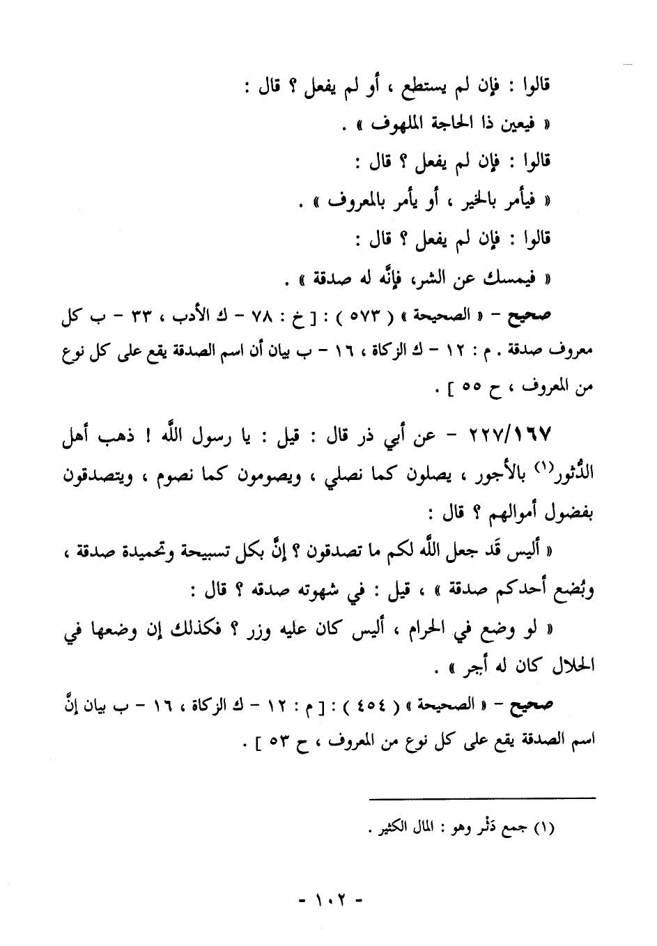 167/227 (صحيح) - عَنْ أَبِي ذَرٍّ قَالَ: قِيلَ: يَا رَسُولَ اللَّهِ! ذَهَبَ أَهْلُ الدُّثُورِ (¬1) بِالْأُجُورِ، يُصَلُّونَ كَمَا نُصَلِّي، وَيَصُومُونَ كَمَا نَصُومُ، وَيَتَصَدَّقُونَ بِفُضُولِ أَمْوَالِهِمْ؟ قَالَ: " أَلَيْسَ قَدْ جَعَلَ اللَّهُ لَكُمْ مَا تَصَدَّقُونَ؟ إِنَّ بِكُلِّ تَسْبِيحَةٍ وَتَحْمِيدَةٍ صَدَقَةً، وَبُضْعُ أَحَدِكُمْ صَدَقَةٌ". قِيلَ: فِي شَهْوَتِهِ صَدَقَةٌ؟ قَالَ: " لَوْ وُضِعَ فِي الْحَرَامِ، أَلَيْسَ كَانَ عَلَيْهِ وِزْرٌ؟ ذَلِكَ إِنْ وَضَعَهَا فِي الْحَلَالِ كان له أجر".