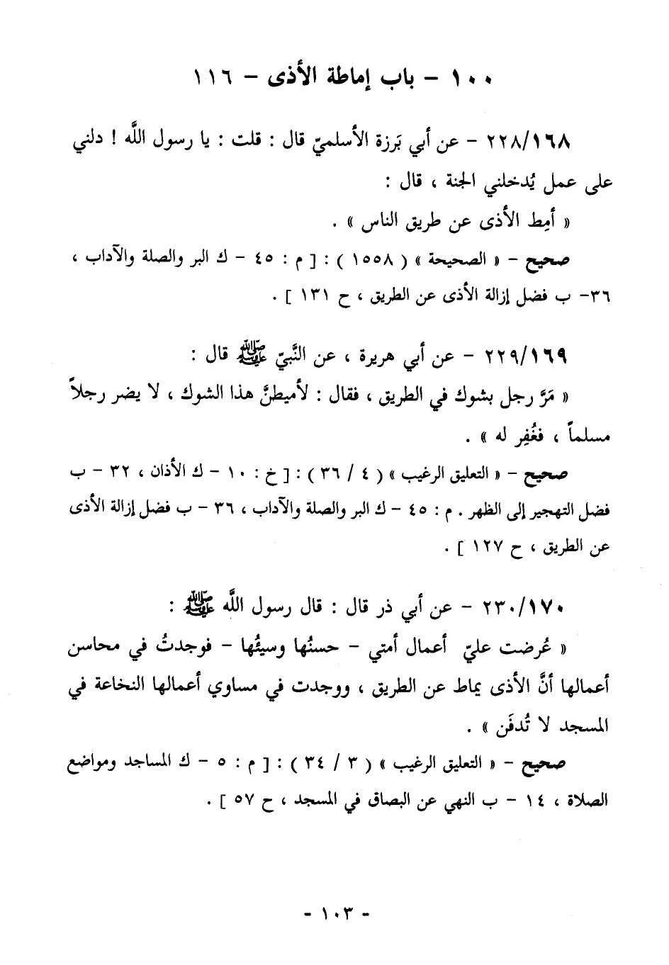 196/229 (صحيح) - عَنْ أَبِي هُرَيْرَةَ [رَضِيَ اللَّهُ عَنْهُ] عَنِ النَّبِيِّ صَلَّى اللهُ عَلَيْهِ وَسَلَّمَ قَالَ: "مَرَّ رَجُلٌ مُسْلِمٌ بِشَوْكٍ فِي الطَّرِيقِ، فَقَالَ: لَأُمِيطَنَّ هَذَا الشَّوْكَ، لَا يَضُرُّ رجلاً مسلماً، فغفر له".